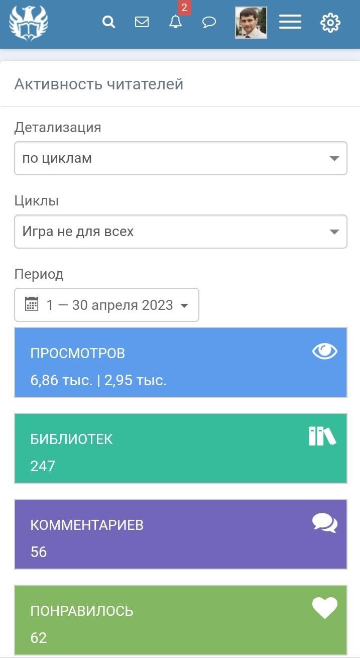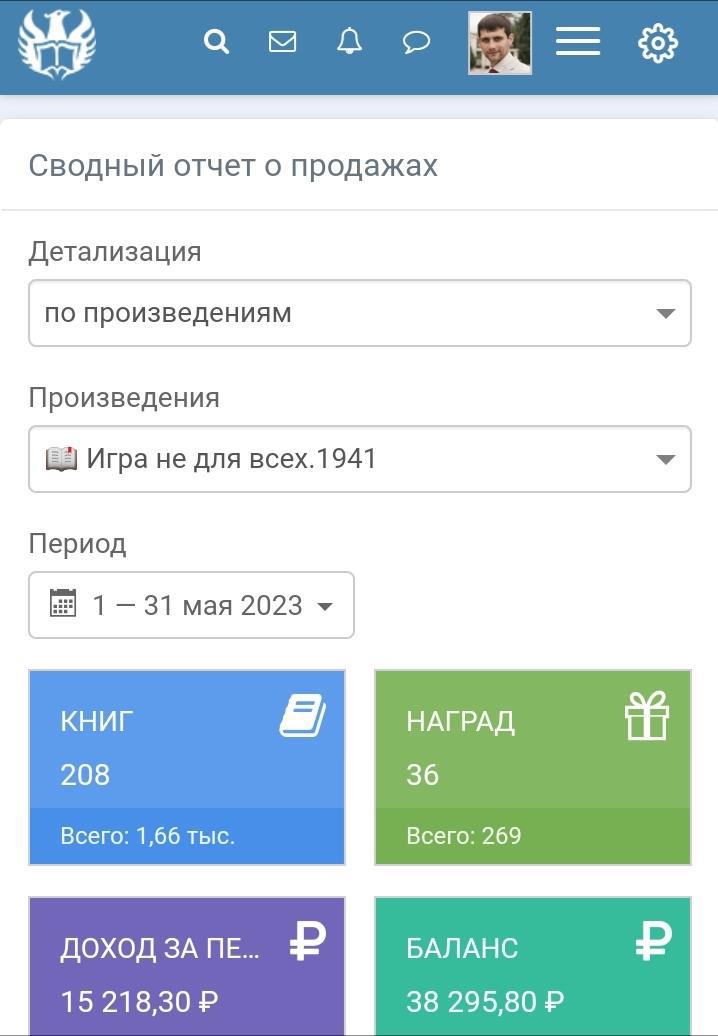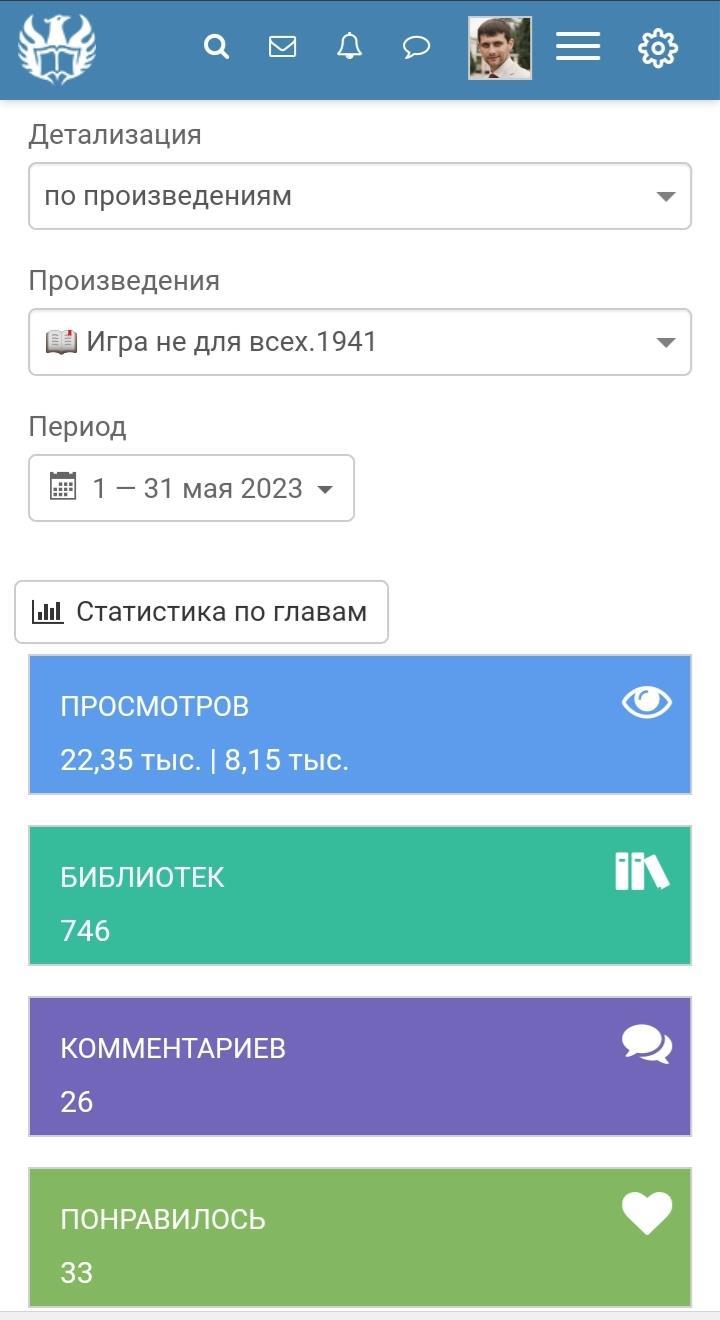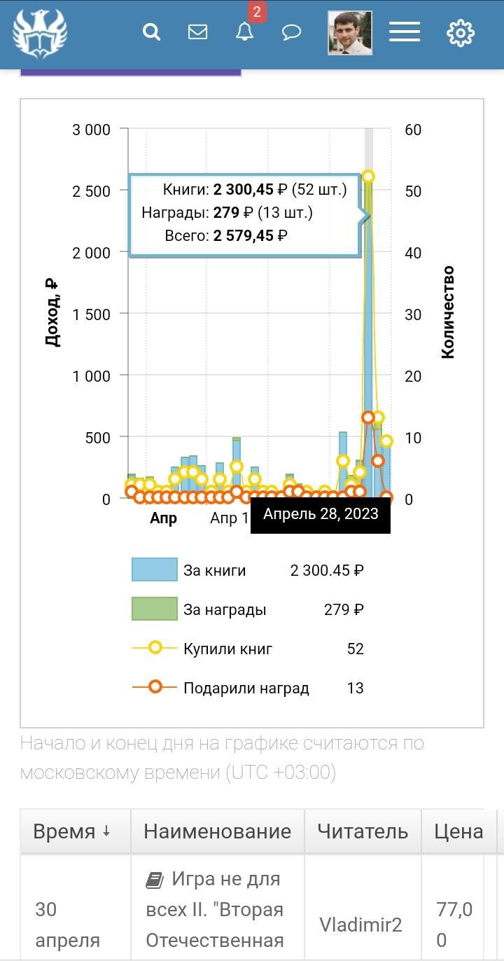 Запущенная 1 мая реклама дала тройную прибыль. Рекламировался цикл "Игра не для всех", но так как последняя его часть "Вторая Отечественная" ещё пишется, то заработанные на ней за месяц 5253 я не считаю. Для сравнения - этот же цикл за апрель: