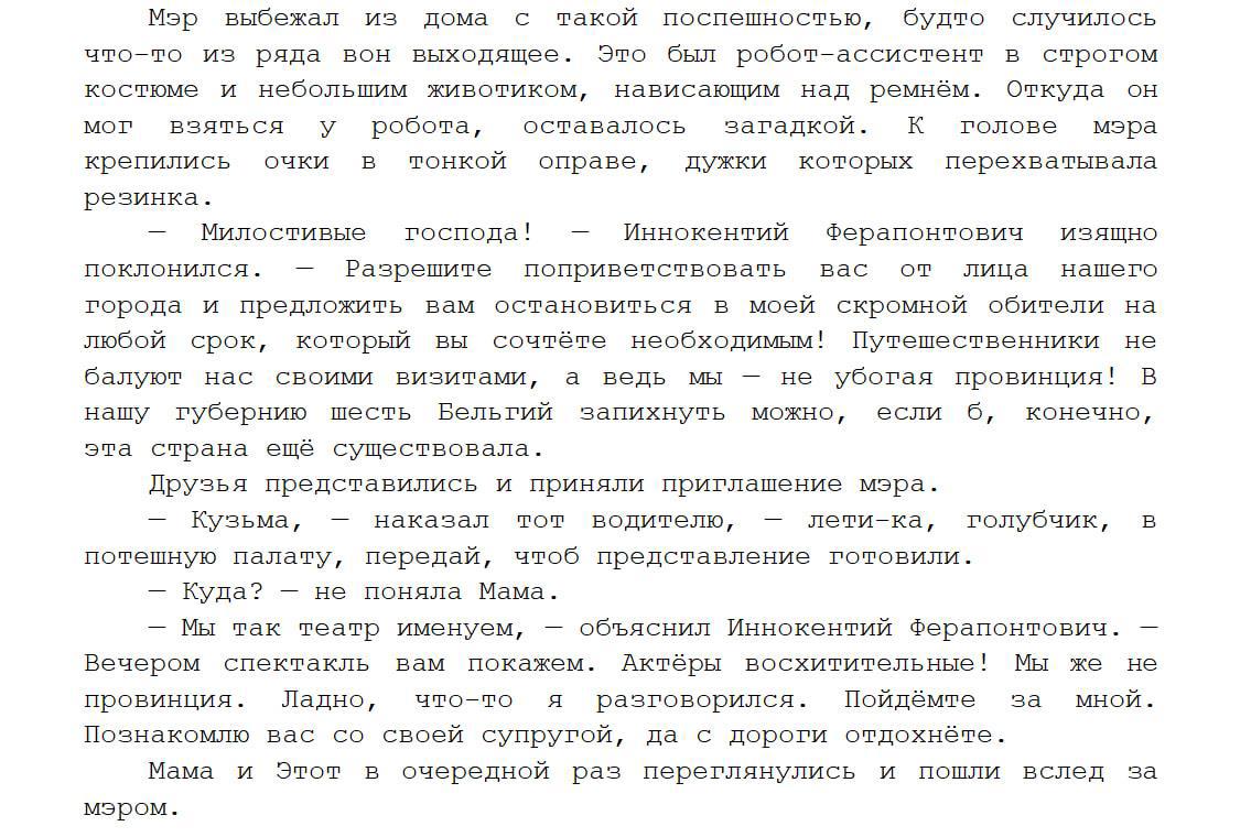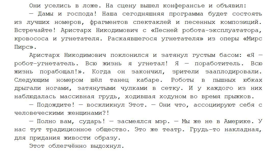 Во-вторых, Этот и Мама, прилетев в Новосибирск, сразу отправляются в лес, хотя могли бы прогуляться по городу и познакомиться с местными роботами. И уклад их жизни вполне мог быть иным, нежели в Рязани, откуда прибыли герои.