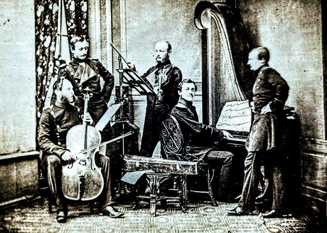 Автор: saganshy Фотография примерно 1865-го года на глаза попала. Суровым пруссакам было не чуждо влечение к прекрасному. Обратите внимание на довольно широко распространённое тогда пианино-жираф ( оно же стоячее флигель-фортепиано, стоячее фортепиано "жираф", стоячее фортепиано-кабинет), или более благозвучно - пианино-арфа.