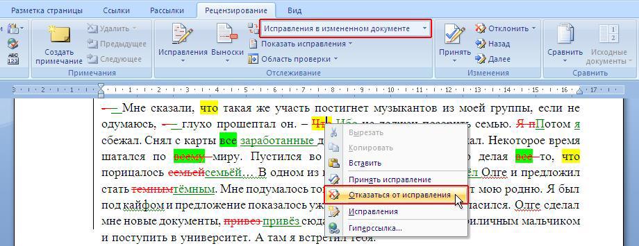 Но что если автора не устраивает правка внесённая редактором или корректором и он хочет её отменить? Тогда открываем вариант «Исправления в изменённом документе»: