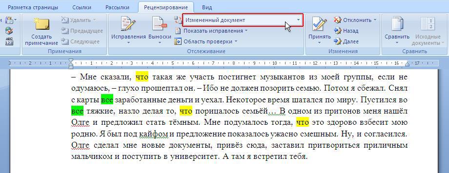 На экране документ, который уже прошёл некую правку, жёлтых и зелёных прямоугольничков стало меньше :).