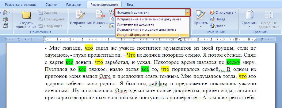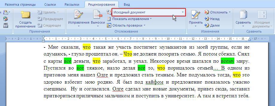 Первоначальный текст, если на вкладке «Рецензирование» выбран вариант «Исходный документ». Для примера двумя маркерами выделены часто повторяющиеся слова, которые мы немного сократим.