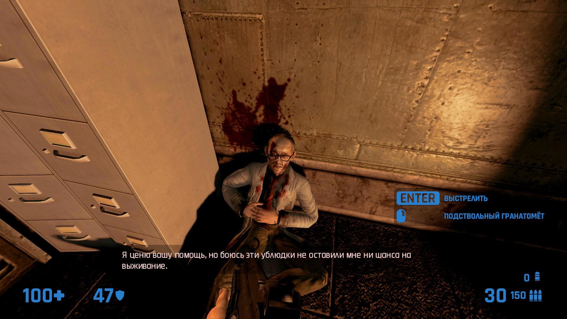 Трое солдат, преследовавших незадачливого учёного смогли загнать того в тупик. Вроде и юркий (хоть и в возрасте) учёный до этого старался как можно аккуратней с небольшой командой охраны добраться до своих знакомых. По пути к ним прибился один человек из технического отдела, но из-за хаоса, происходящего в комплексе это было задачей сродни закрытием пулемётной амбразуры голым телом.