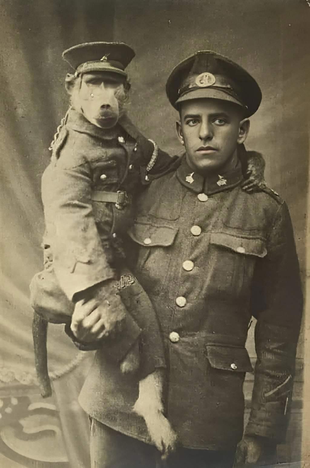 (На фото рядовой Альберт Марр и бабуин Джеки, 1918 год, Великобритания)
