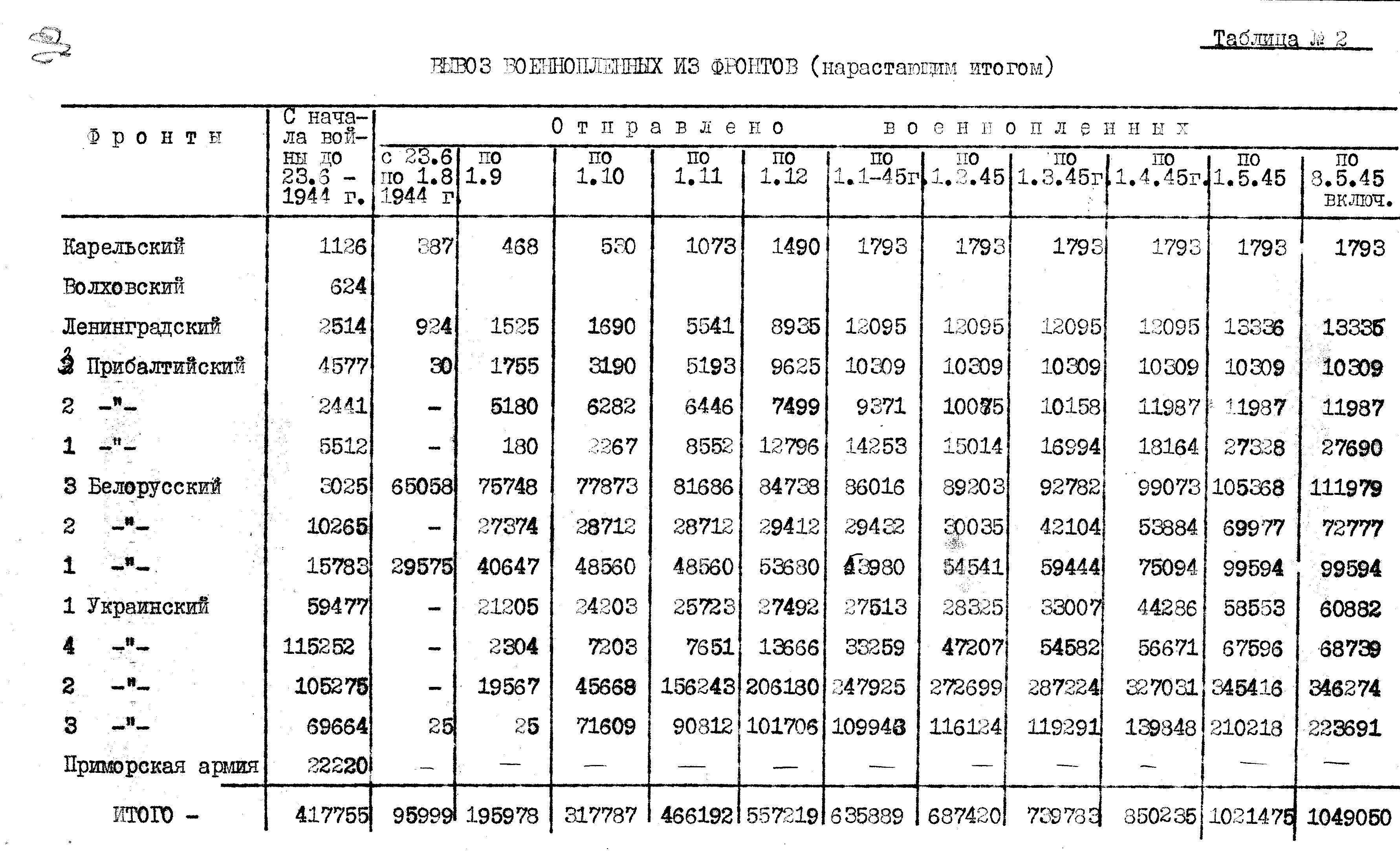 Всего за период с 23 июня 1944г. по 9 мая 1945г. в тыловые лагери НКВД вывезено около одного миллиона пятидесяти тысяч военнопленных, распределений которых по фронтам и месяцам показывает следующая таблица. (См. таблицу №2).