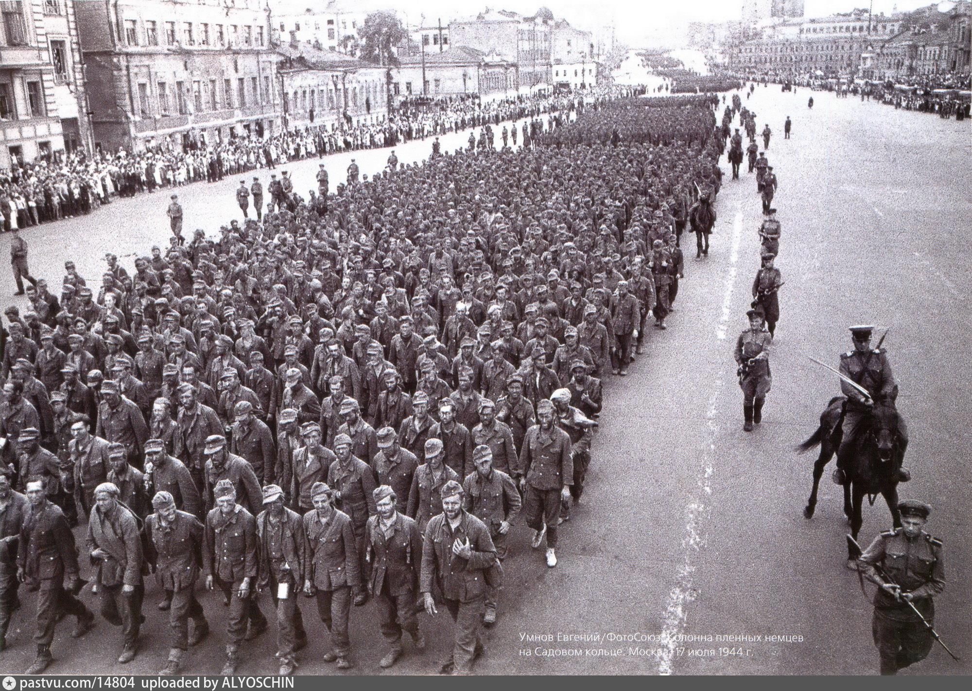 Военно-продовольственные пункты, по разработанным маршрутам, ко времени движения эшелонов, получили указания Штаба Начальника тыла КА через "З” дорог о довольствии горячей пищей и кипятком проходящих эшелонов с военнопленными. Из отправленных 45 эшелонов на 16.7-44 г. в г. Москве было разгружено только 30 эшелонов, остальные с хода были переадресованы в производственные лагери НКВД. Общая численность военнопленных, прибывших в Москву к 16.7-44г., в 30 эшелонах составляла до 68 тысяч, из которые 45 тысяч было разгружено и размещено на ипподроме, до 20 тысяч - на территории Кавгородка и около 3-х тысяч раненых и больных направлено в специально выделенные указанием Штаба Начальника тыла КА и подготовленные ГВСУ КА госпитали.