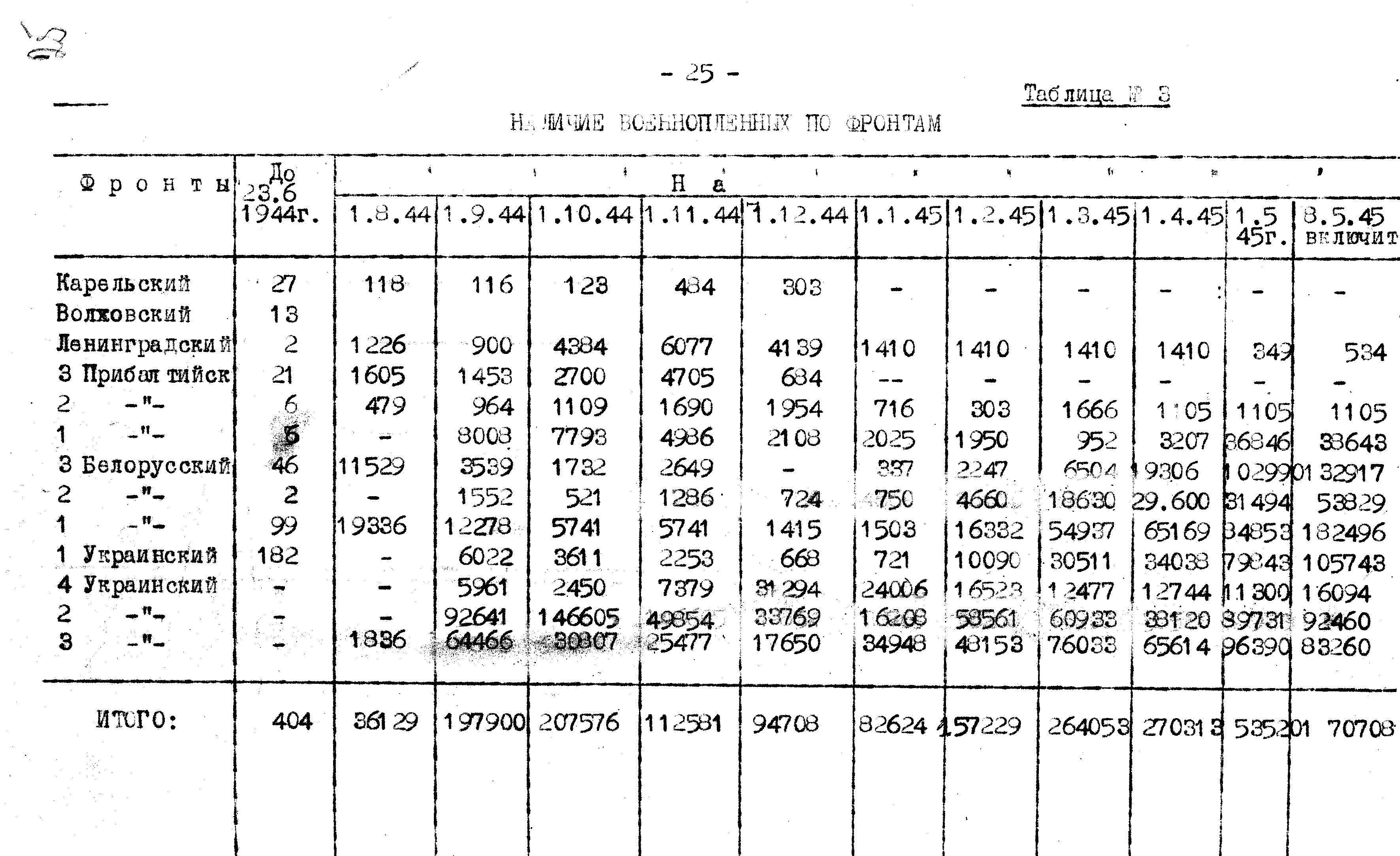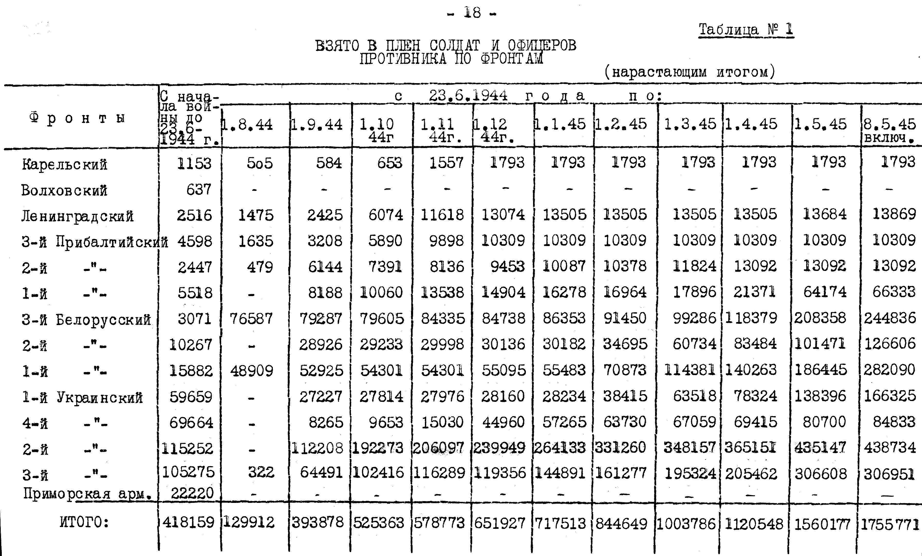 Следующие данные характеризуют рост военнопленных суммарно на Украинских, Белорусских и Прибалтийских фронтах по периодам наступательных операций до момента капитуляции Германии:
