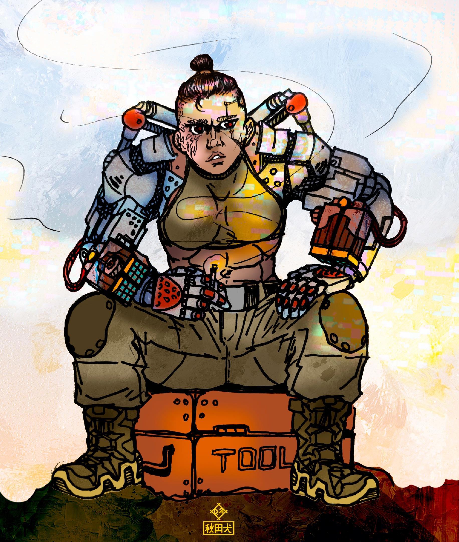 Селеста Моралес. Женщина с ожегами на лице и кибернетическими руками. На спине закреплена поддерживающая конструкция.