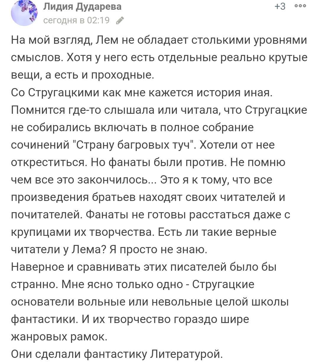 Стругацких часто сравнивали со Станиславом Лемом, не менее значительным фантастом. Нередко — в пользу последнего