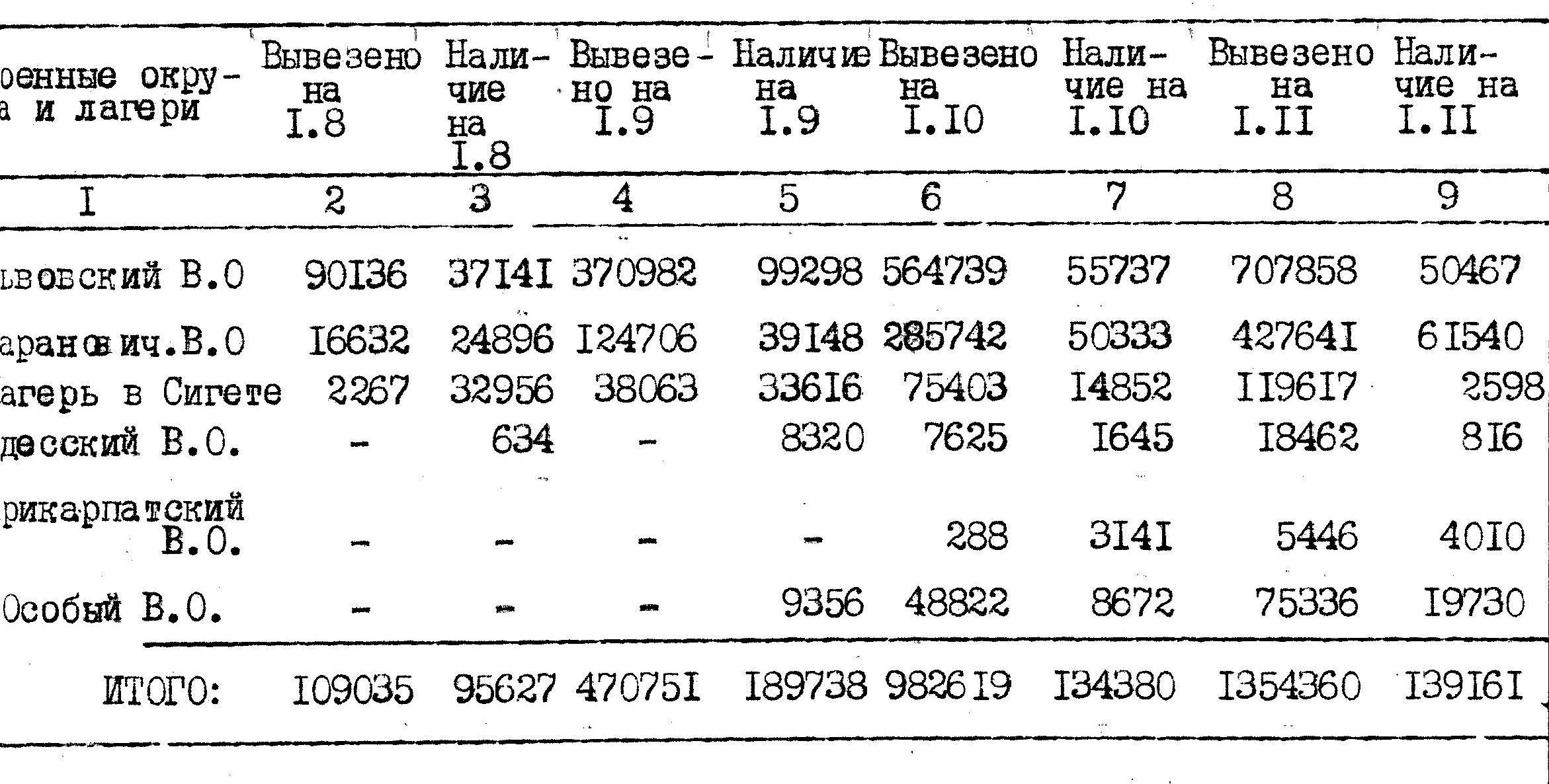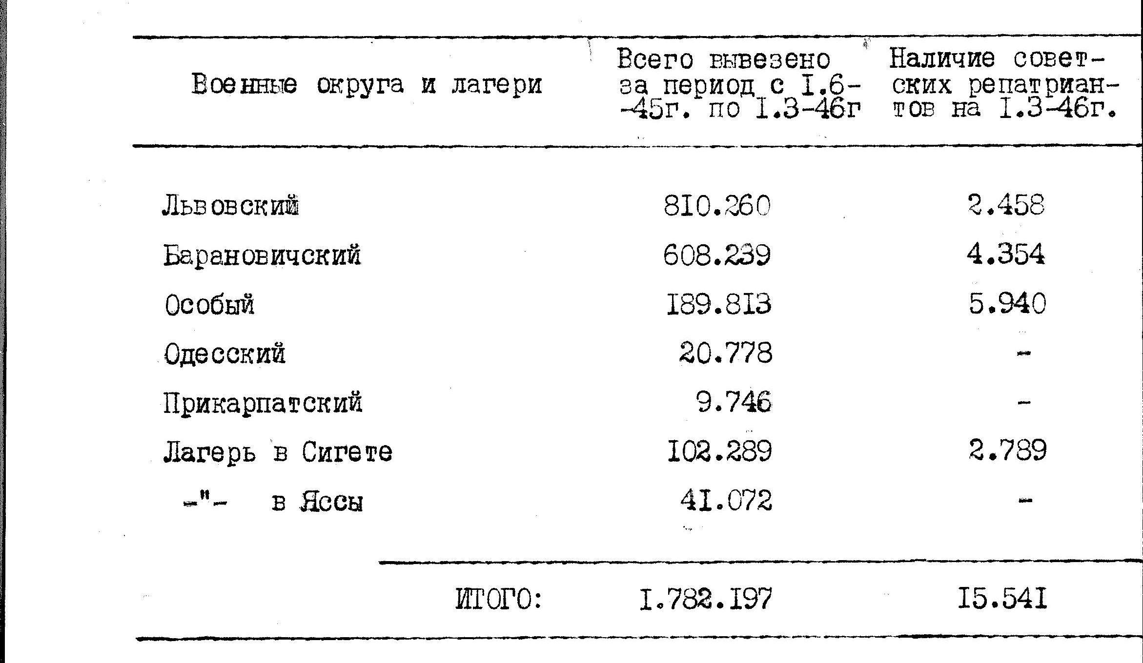 Вывоз за 9 месяцев из приграничных лагерей до 1.800 тысяч советских репатриантов подтверждает сказанное выше о больших масштабах работы, проведенной Штабом Начальника тыла КА также и в приграничных военных округах по подготовке лагерей к размещению, материальному и медико-санитарному обеспечению репатриантов (даже в зимних условиях) и вывозу их в места вселения.