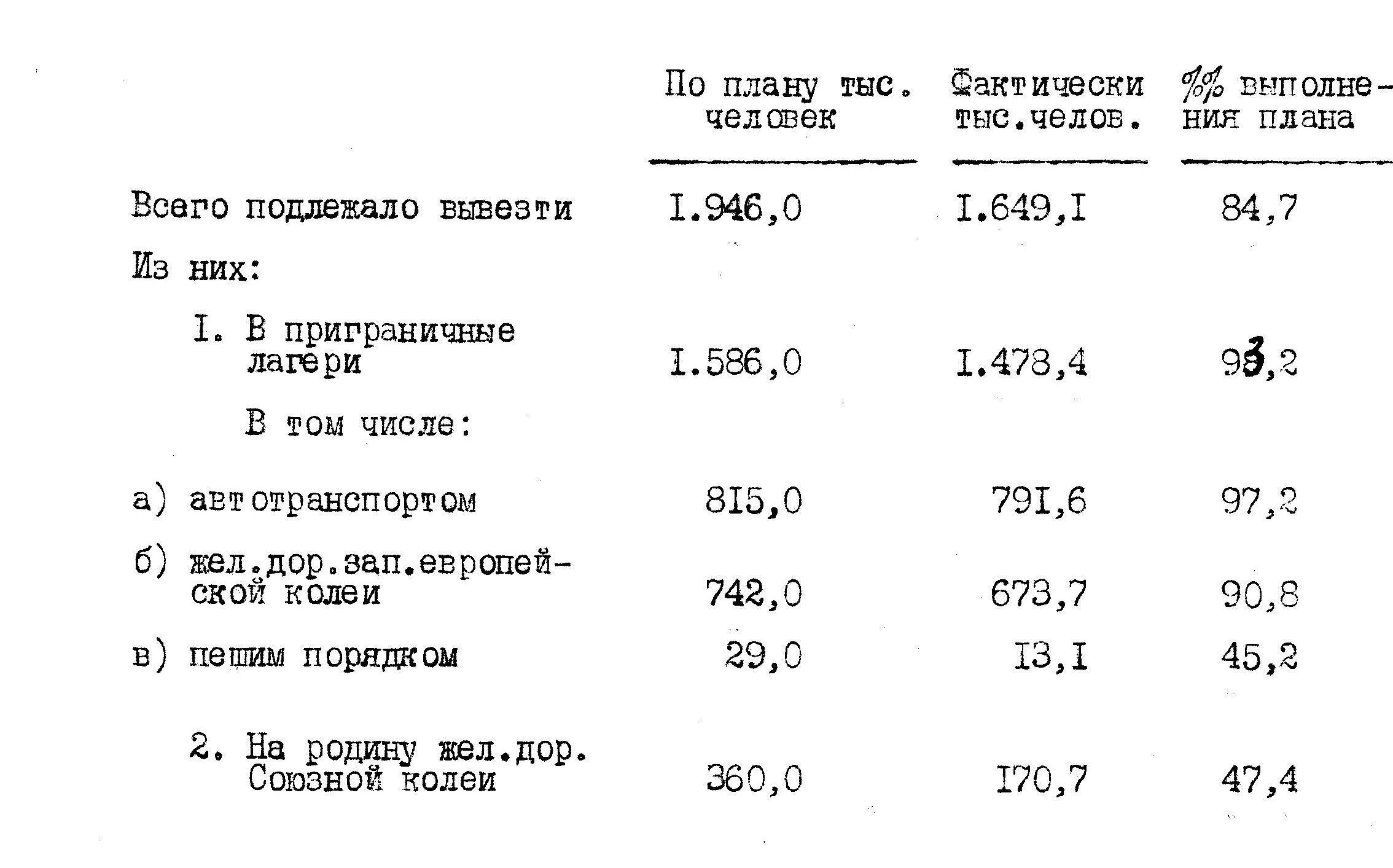 Таким образом, из подлежащих вывозу по плану 1.946 тысяч человек фактически вывезено 1.649,1 тыс. репатриантов или 84,7%. План же вывоза в приграничные лагери оказался выполненным на более высоком уровне и составил 93,2%, из которых выполнение плана составило: по автотранспорту - 97,2%, жел.дор. зап.-европ. колеи - 90,8% и пешим порядком - 45,2%.