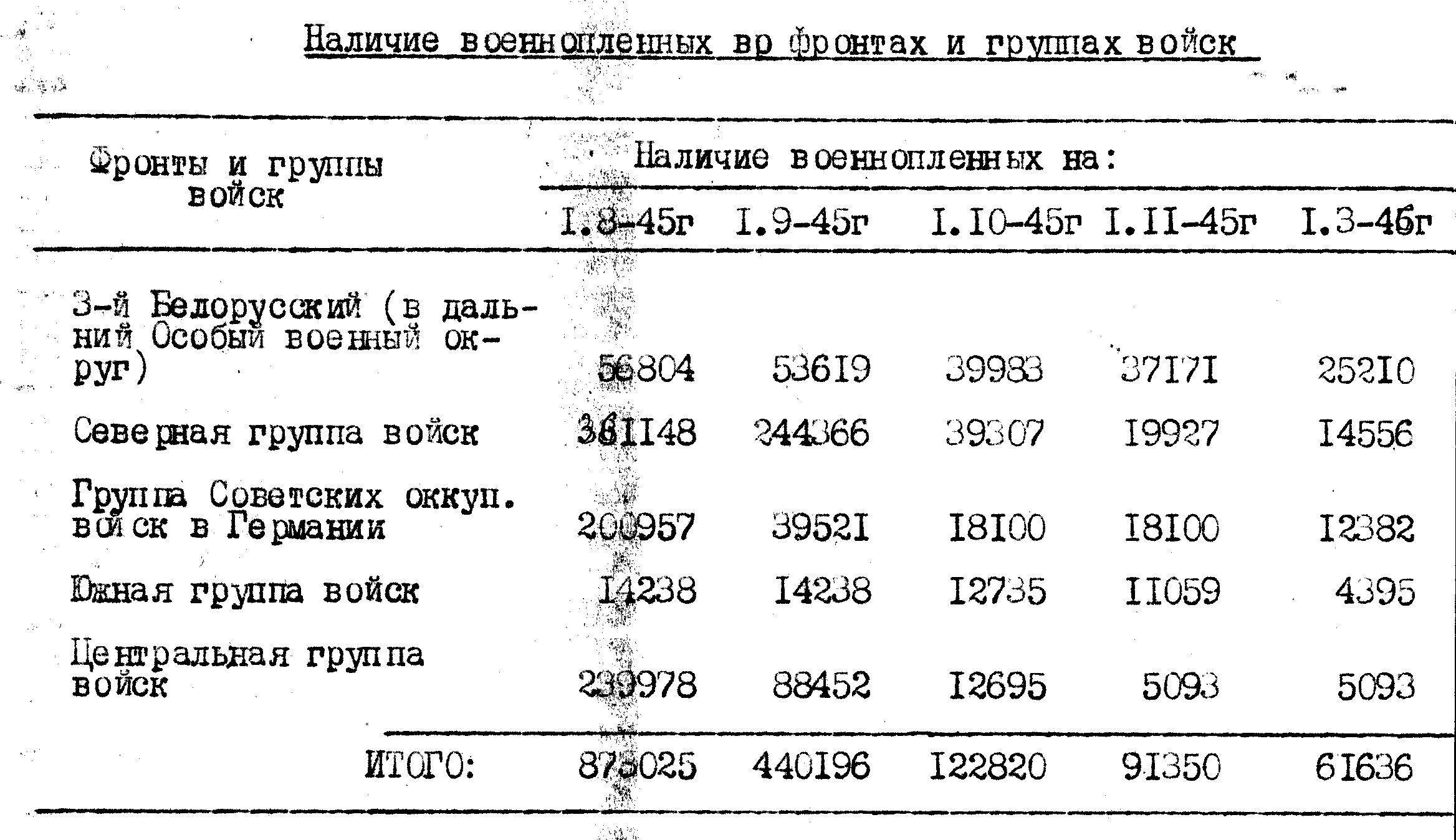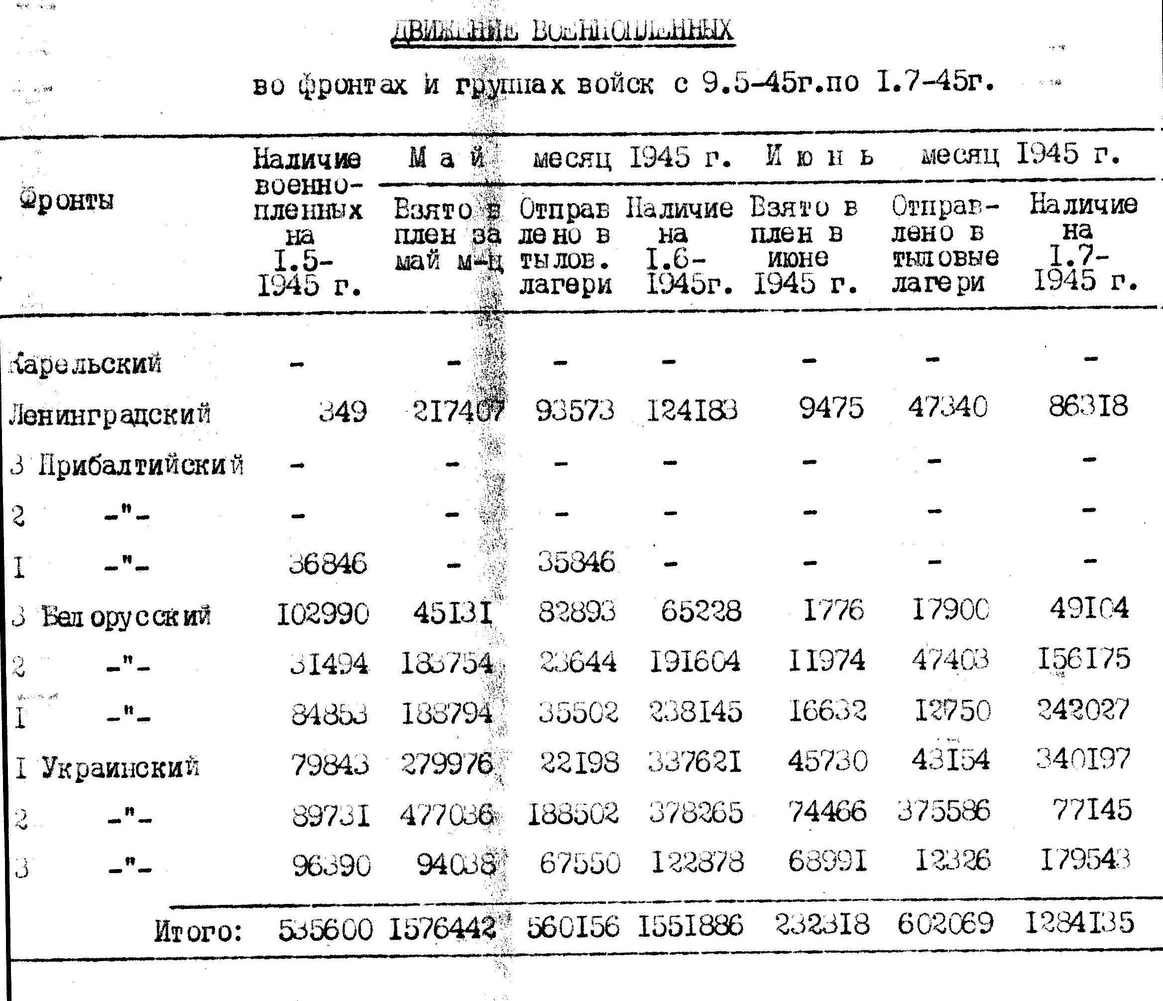 Приводимая ниже таблица о движении в военнопленных во фронтах дает представление о проведенной работе по эвакуации военнопленных за период с 9.5 по 1.7-45 года.