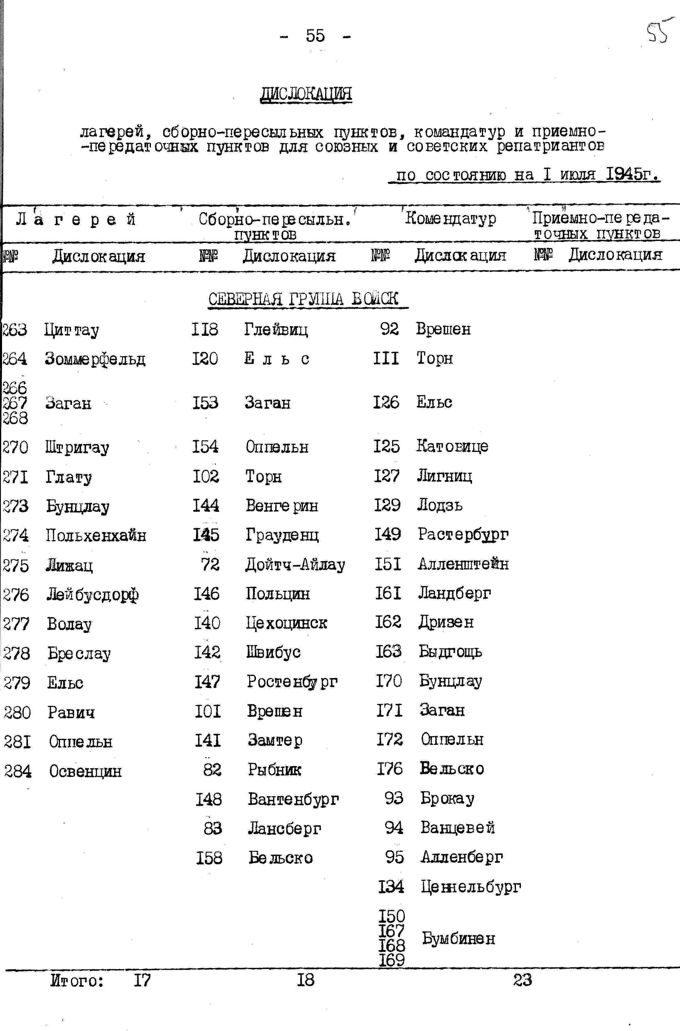 Значительная численность советских граждан и бывших военнослужащих КА, оказавшихся на территории Германии и Австрии, освобожденной войсками союзников и сообщение Союзного командования о проводимой подготовке их к передаче Командованию Красной Армии - потребовала значительного расширения во фронтах (в последующем в группах войск) сети по репатриации. Вследствие этого директивой Генерального Штаба Красной Армии № 11086 от 11.5-45 г., дополнительно к имеющимся фронтовым сборно-пересыльным пунктам, было сформировано 100 лагерей для содержания и дальнейшего направления принимаемых от Союзного командования советских репатриантов. Указанной выше директивой ГШКА было установлено следующее распределение подлежащих формированию лагерей по фронтам: