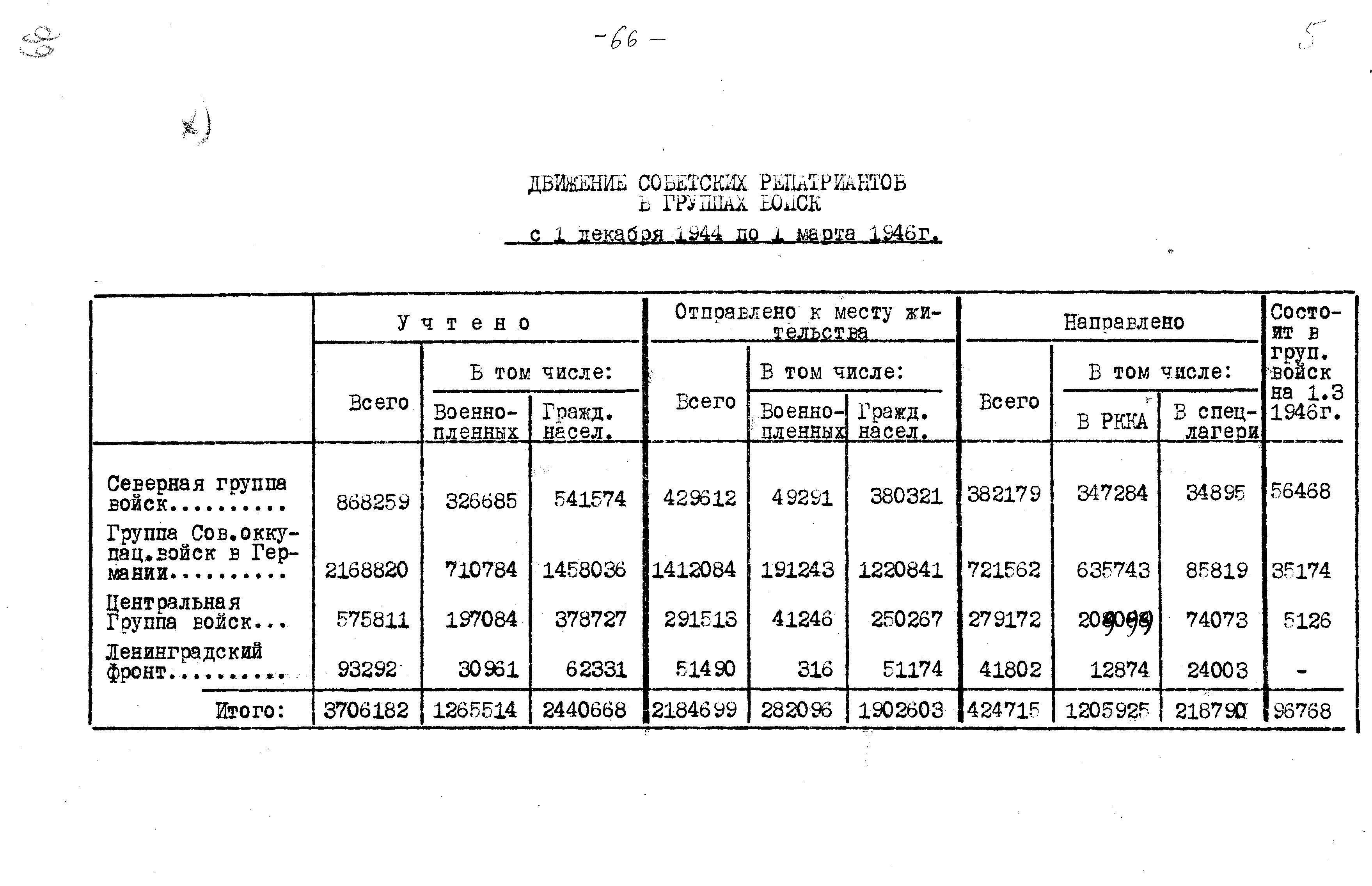 Таким образом, всего освобождено войсками Красной Армии и принято от Союзного командования 3.706.182 советских репатрианта, из которых на 1 марта эвакуировано в тыл страны 3.609.414 человек и на ту же дату состояло в группах войск 96.768 человек, из которых до 60 тысяч оставлено на работах в войсках. Незначительные остатки на 1.3-46г. советских репатриантов как в группах войск, так и в приграничных лагерях свидетельствует об окончании массовой эвакуации советских репатриантов.