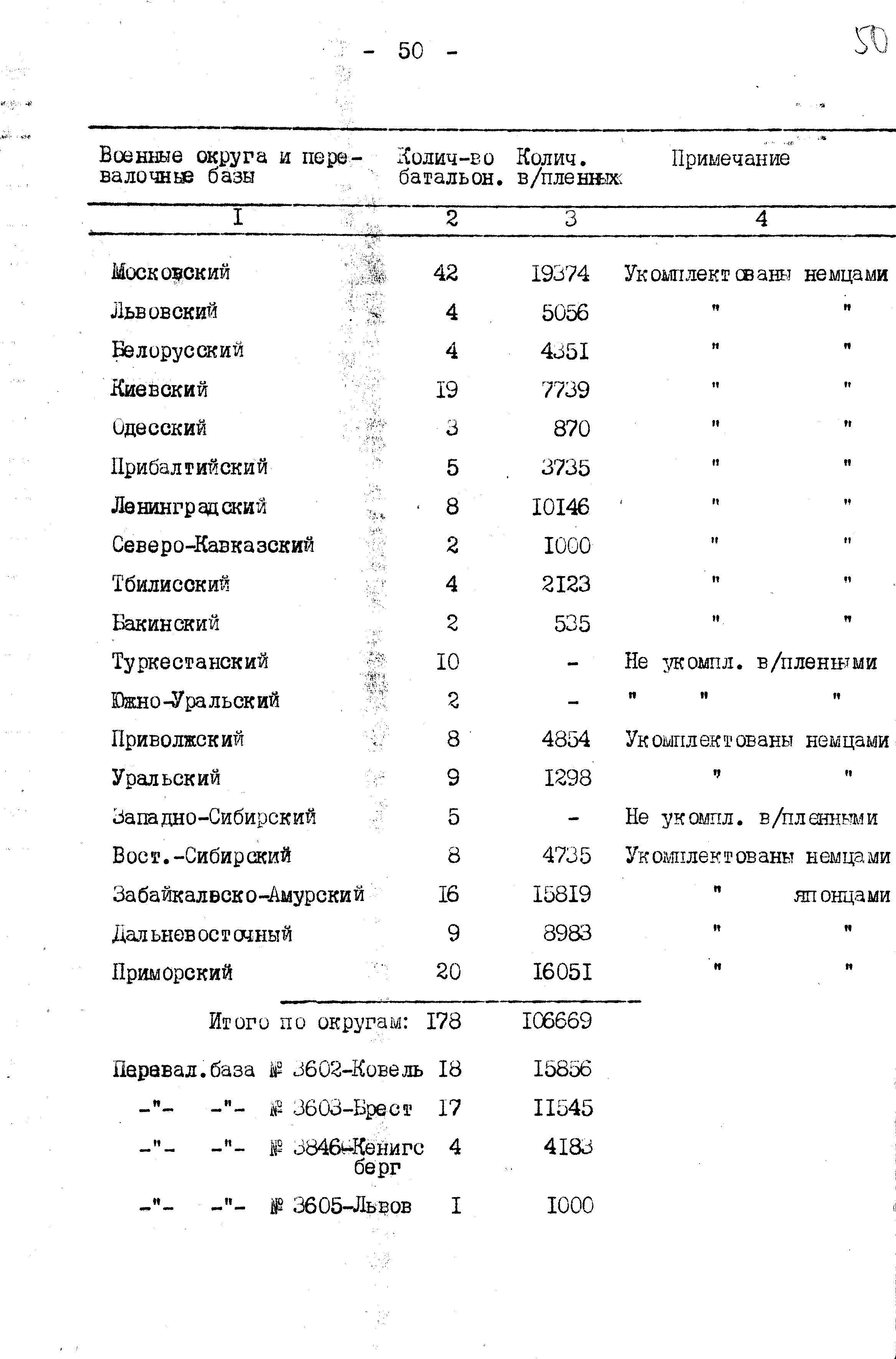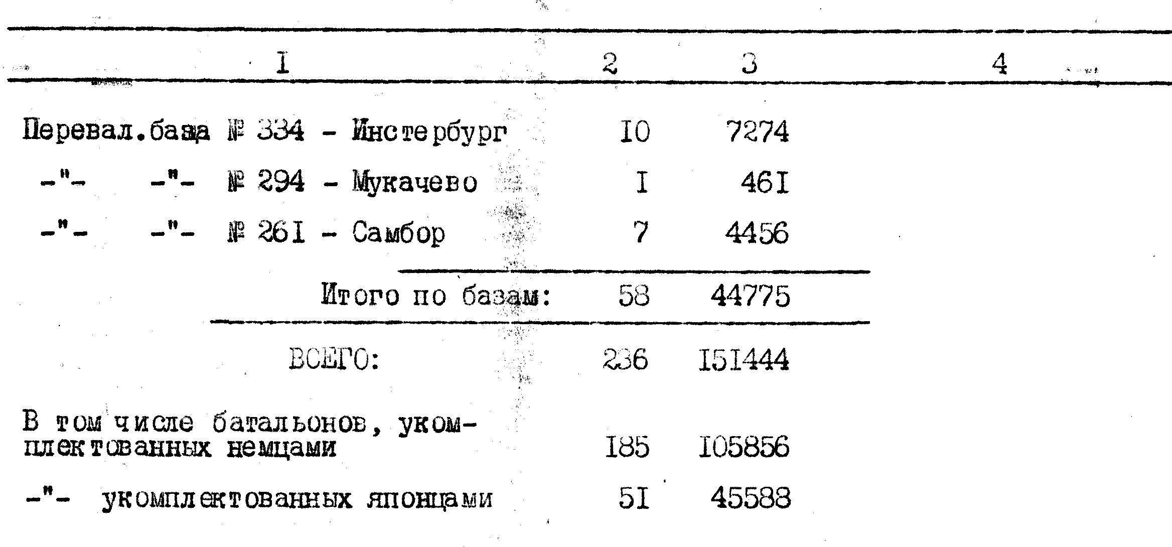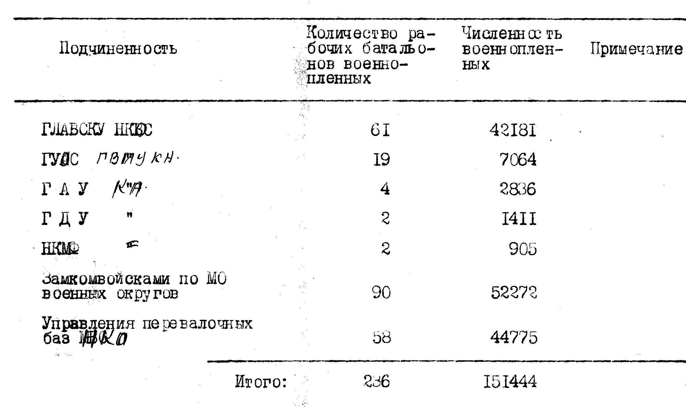 Постановлением СНК СССР № 8921сс от 4.6-45 г., в распоряжение Начальника тыла КА, НКВД СССР было передано из тыловых лагерей 152 тысячи военнопленных, которые по директивам ГШКА были обращены на укомплектование 236 рабочих батальонов военнопленных. Приказом Начальника тыла КА рабочие батальоны военнопленных были распределены по военным округам и перевалочным базам и по состоянию на 1.3-46 г. имели следующую численность: