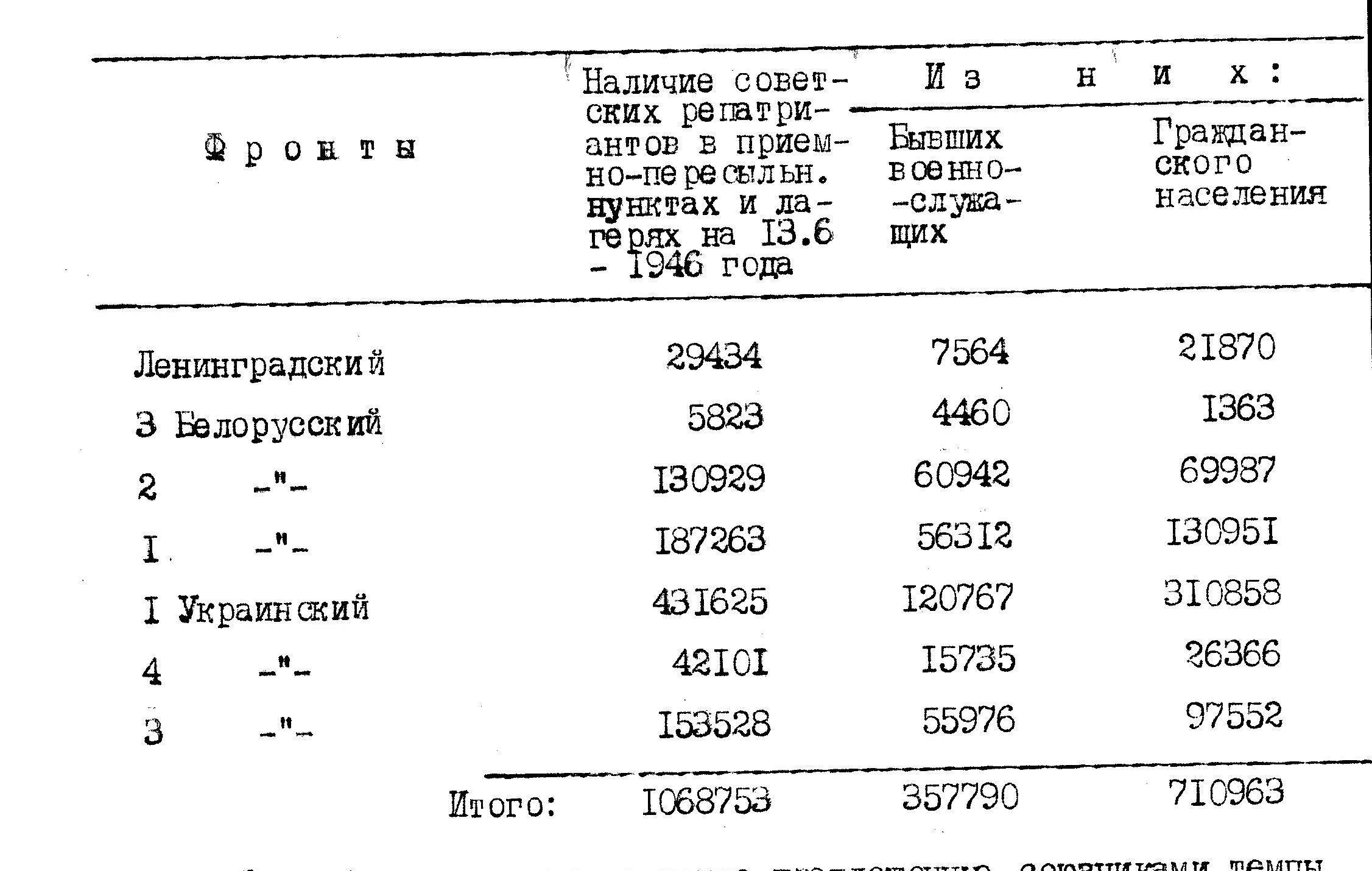 Приводимая ниже таблица показывает наличие советских репатриантов во фронтах на ту же дату: