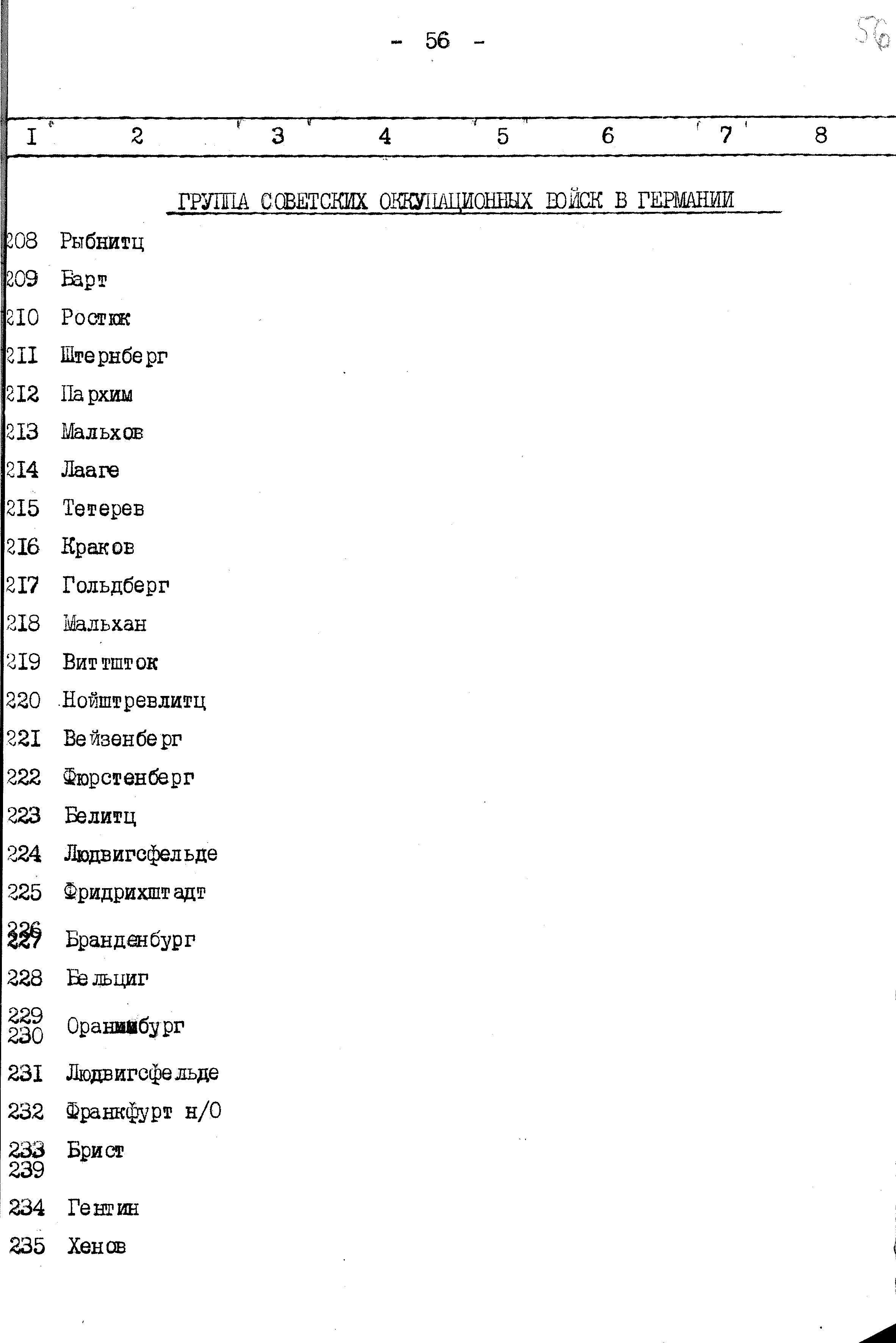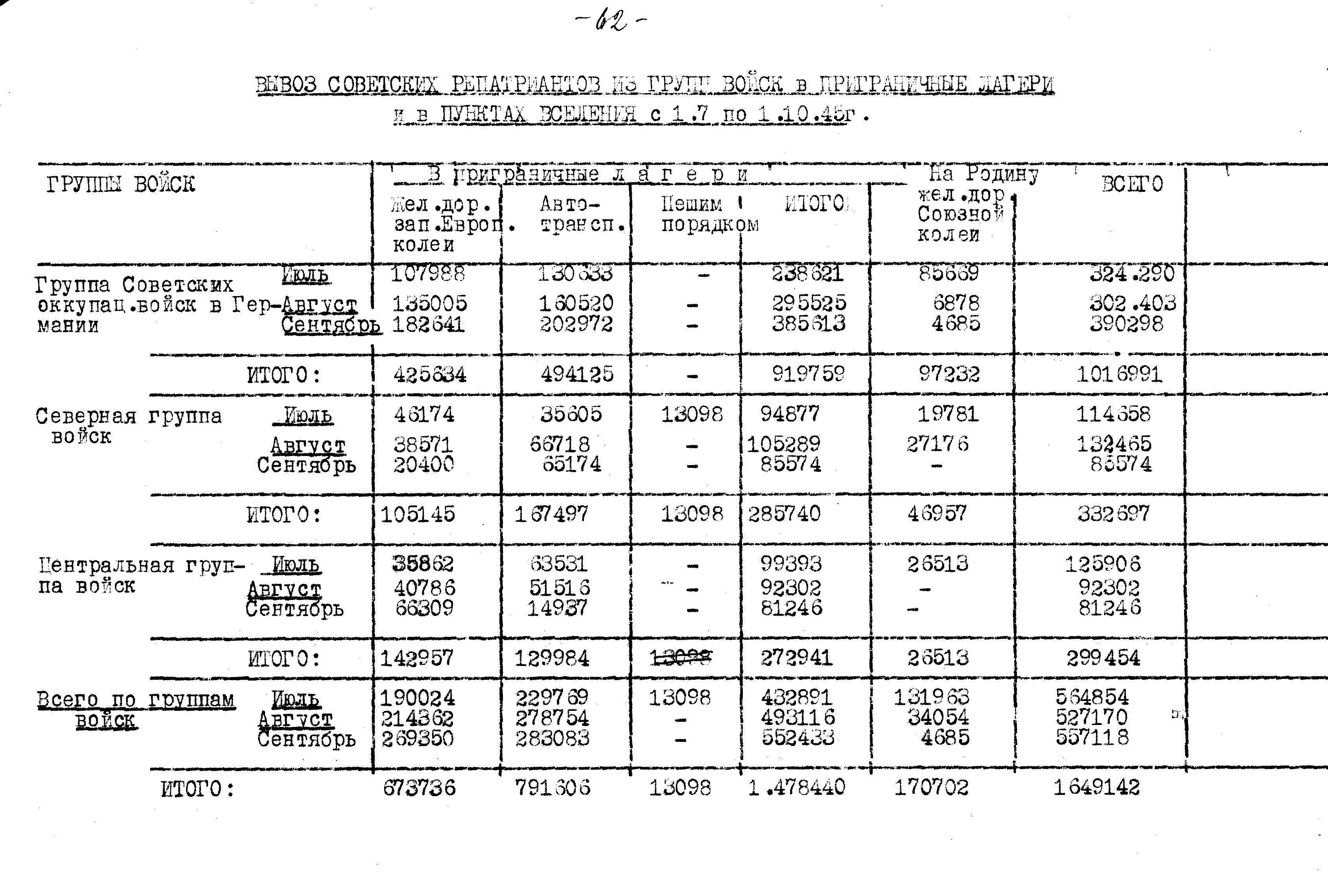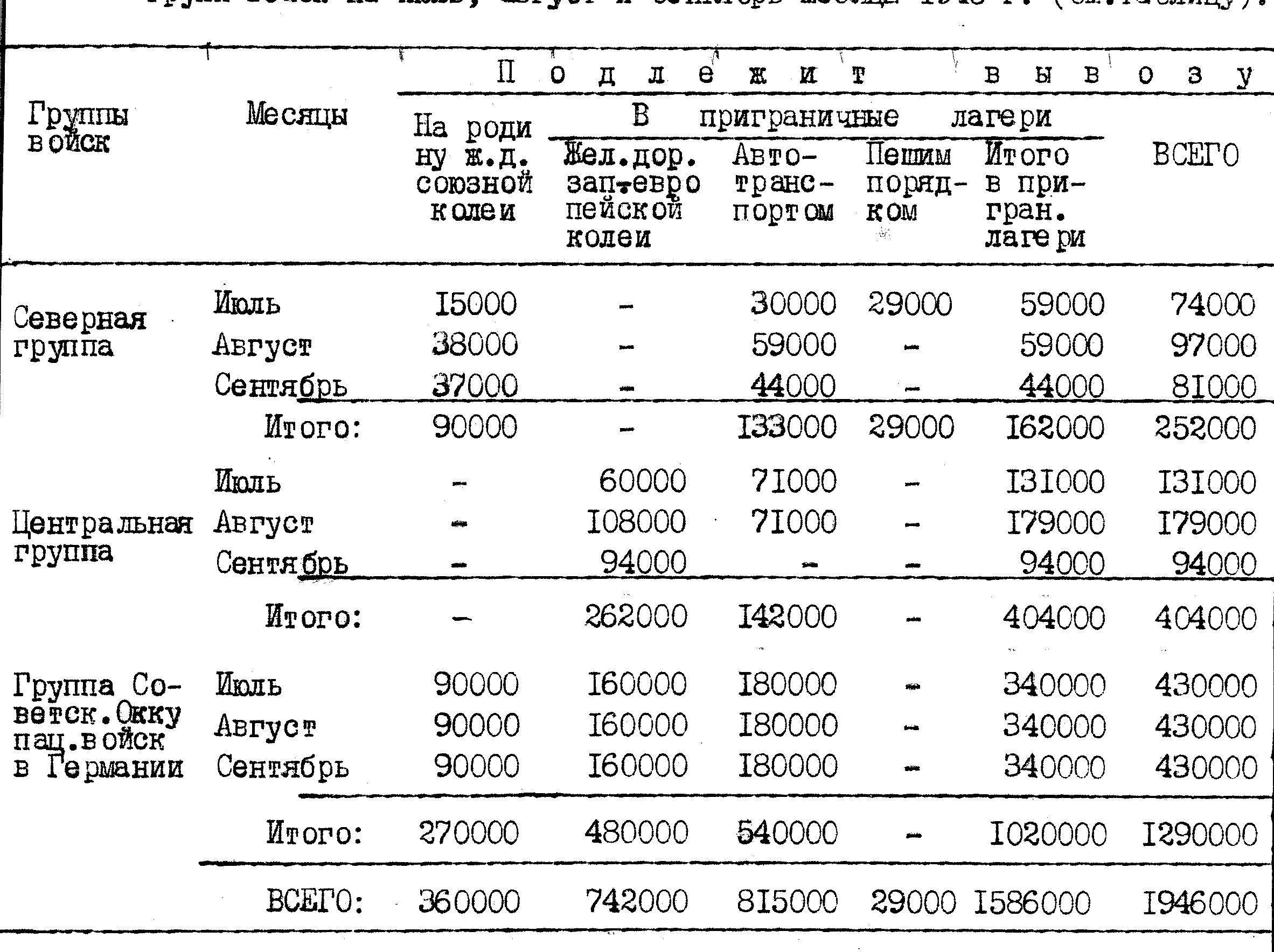 Во исполнение постановлений ГОКО № 9054с, 9055с и 9821сс директивами Заместителя Народного Комиссара Обороны СССР т. БУЛГАНИНА №№ 104323 от 3.7, 104377 - от 7.7 и 104349 от 5.7-45 г. был установлен следующий план вывоза на родину советских репатриантов из групп войск на июль, август и сентябрь месяцы 1945 г. (См. таблицу).