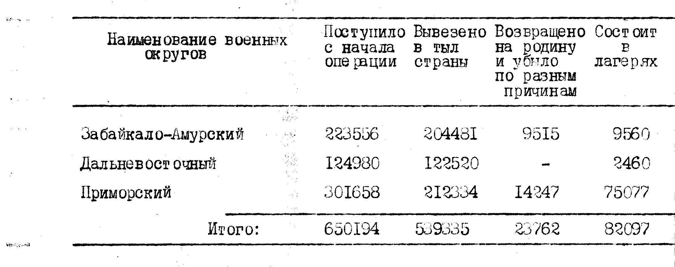 Приводимая ниже таблица дает представление о движении военнопленных японской армии в Дальне-Восточных военных округах по состоянию на 15 февраля 1946 года: