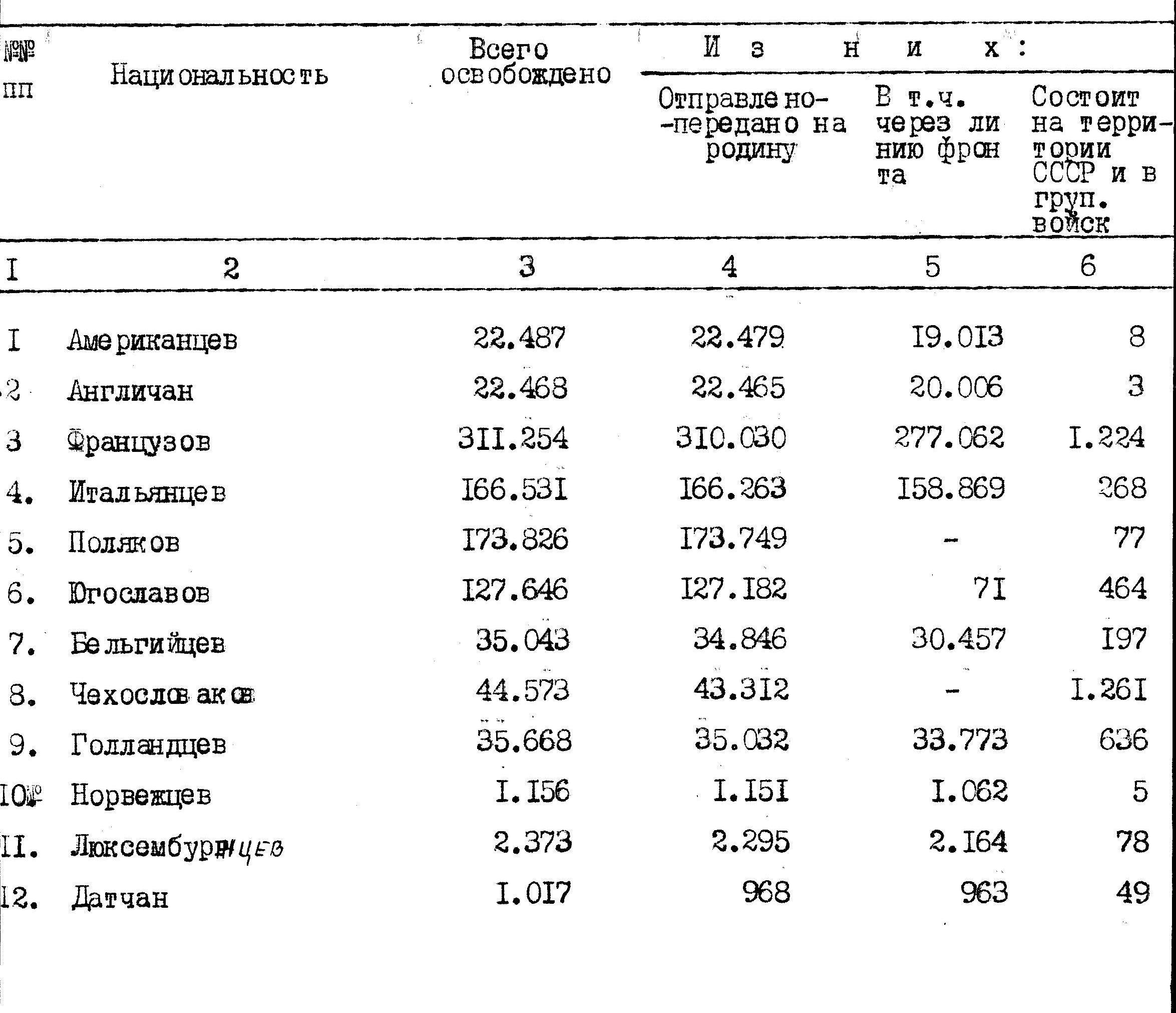 Об эвакуации на родину и наличии союзных и иностранных репатриантов в группах войск и на территории СССР за тот же период по национальностям дает представление следующая таблица: