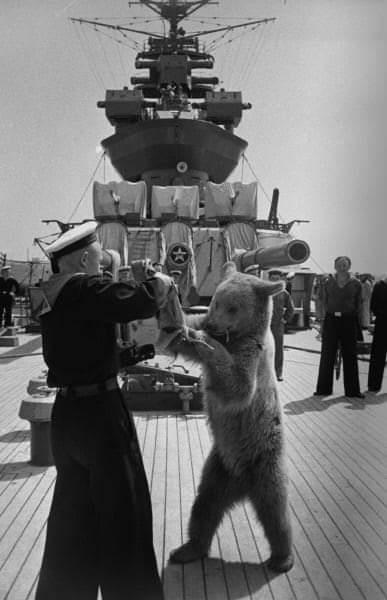 Даже на переданных в лизинг от союзников кораблях советского флота тоже жили медведи! На последнем из приведенных выше трех фото: два мишки-талисмана на борту HMS ROYAL SOVEREIGN, после его переименования в "Архангельск" и введения в состав Северного флота ВМФ СССР!