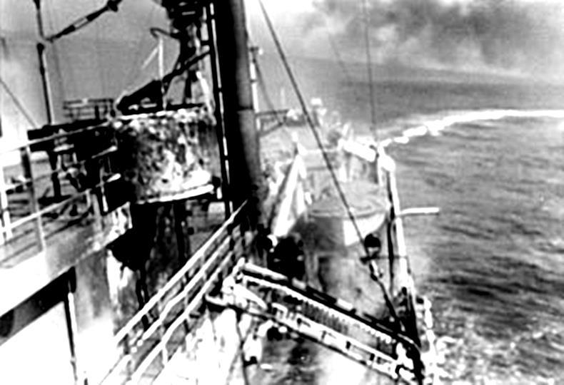 За считанные секунды одна торпеда прошла за кормой корабля примерно в 25 ярдах. Минуту спустя вторая торпеда ударило в корабль по правому борту, прямо перед мостиком и на несколько футов ниже ватерлинии. Она попала в шпангоут.Взрыв торпеды пробил дыру в борту корабля, которая простиралась от нескольких футов над ватерлинией и вниз. По форме отверстие напоминал каплю слезы и имел 39 футов в поперечнике в самом широком месте.