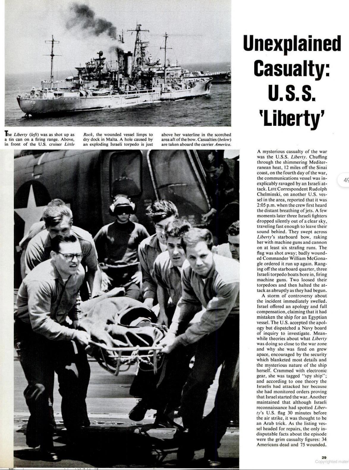 Суть её сводилась к тому, что в результате необъяснимой трагической случайности вначале израильскими самолётами, а потом и торпедными катерами был атакован американский корабль "Liberty ". Корабль продырявили как жестяную банку на стрельбище. Отмечался командир "Liberty", командер МакГонагл. Напичканный электронным оборудованием, корабль был помечен как "корабль-шпион".;и согласно одной из теорий, израильтяне напали на нее, потомучто в результате слежки были перехвачены приказы, доказывающие, что Израиль начал войну. Указывалось, что погибло 34 американца и 75 ранено. Израиль принес извинения и готовность к полной компенсацию вреда, заявив, что он принял судно за египетское. США приняли извинения, но направили комиссию по расследованию ВМС для проведения расследования.