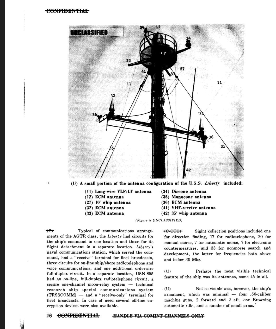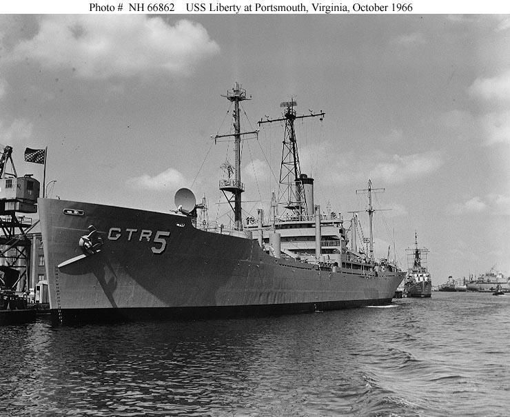 . Зоны связи находились под непосредственным контролем специалиста АНБ. Бортовой диспетчер АНБ, участвовавший в миссии “Либерти” в июне 67-го, был известен экипажу как "майор". На борту находились 358 человек - 160 моряков, остальные - техперсонал по обслуживанию спецаппаратуры, морпехи и переводчики с арабского, иврита и русского. На вооружении для защиты самое мощное оружие - 4 пулемёта "Браунинг" 12,7 мм.