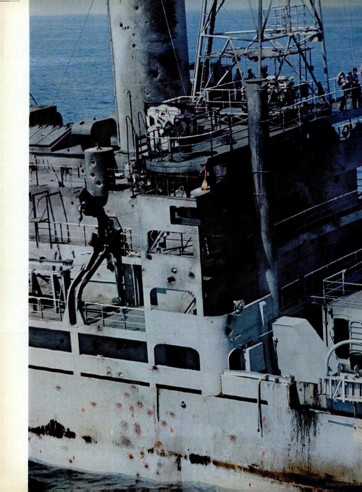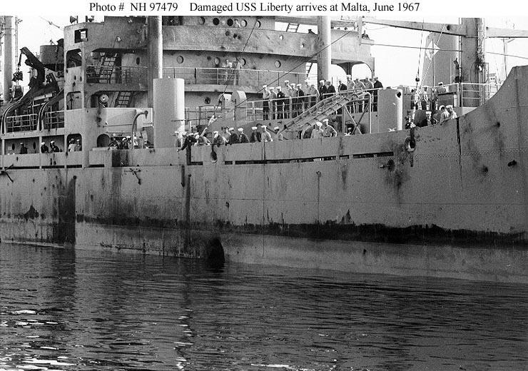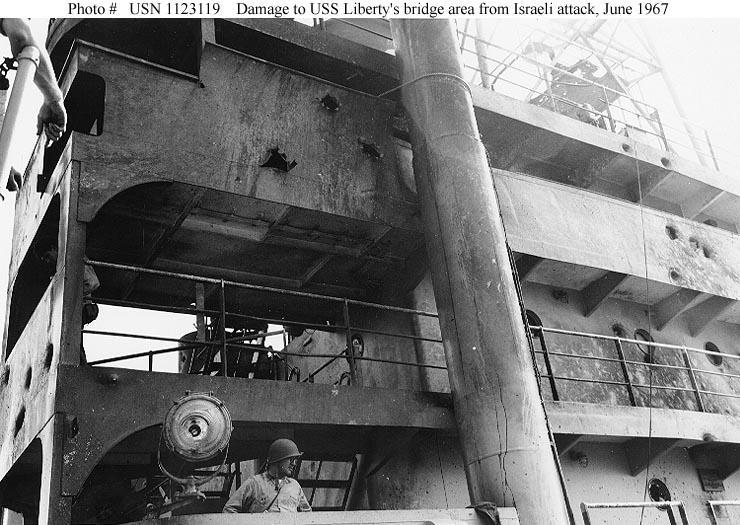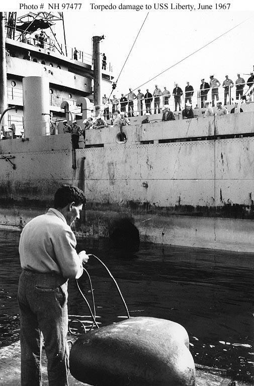 В итоге затопило все отсеки на двух палубах ниже ватерлинии, от шпангоута 53 до шпангоута 66. Там как раз находились помещения с секретным оборудованием. Двадцать пять человек погибли в этих местах, некоторые из взрыв, другие утонули. Попадание зачли Т-203, в настоящее время штурвал и рында с этого катера находятся в музее ВМФ Израиля с указанием, что катер нанес удар по "Liberty". И снова, используя сеть Hicom, "Либерти" передала в эфир, что судно было торпедировано и сильно накренилось. Затем торпедные катера приблизились и обстреляли корпус корабля из своих пушек и пулеметов.По словам некоторых членов экипажа, торпедные катера открыли огонь по группам контроля повреждений и морякам, готовившим спасательные плоты к спуску на воду. Два плота были расстреляны, а третий был подобран T203 и обнаружен с опознавательными знаками ВМС США. Затем T204 обогнул Либерти, и Орен заметил обозначение GTR-5, но, как утверждал, флага не увидел. Израильтяне запросили , не нужна ли помощь, коммандер МакГонагл приказала сигнальщику поднять международный флаг-сигнал "не под командованием" , означающий, что корабль маневрирует с трудом и что они должны держаться подальше. По неофициальной он приказал отбить в ответ "FUCK YOU". Прибыли два израильских вертолёта, с одного из них сбросили на палубу записку