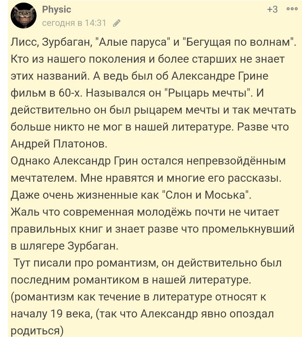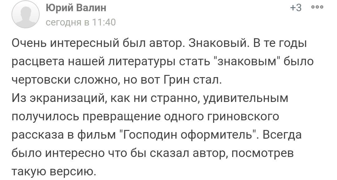 N.B. Я "познакомился" с творчеством Александра Грина впервые в раннем детстве, увидев фильм "Алые Паруса". Книги его я начал читать значительно позже.