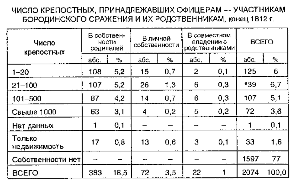 То есть 80% офицеров не имело крепостных вообще, а 77% не имело никакой собственности, и жило на одну зарплату.