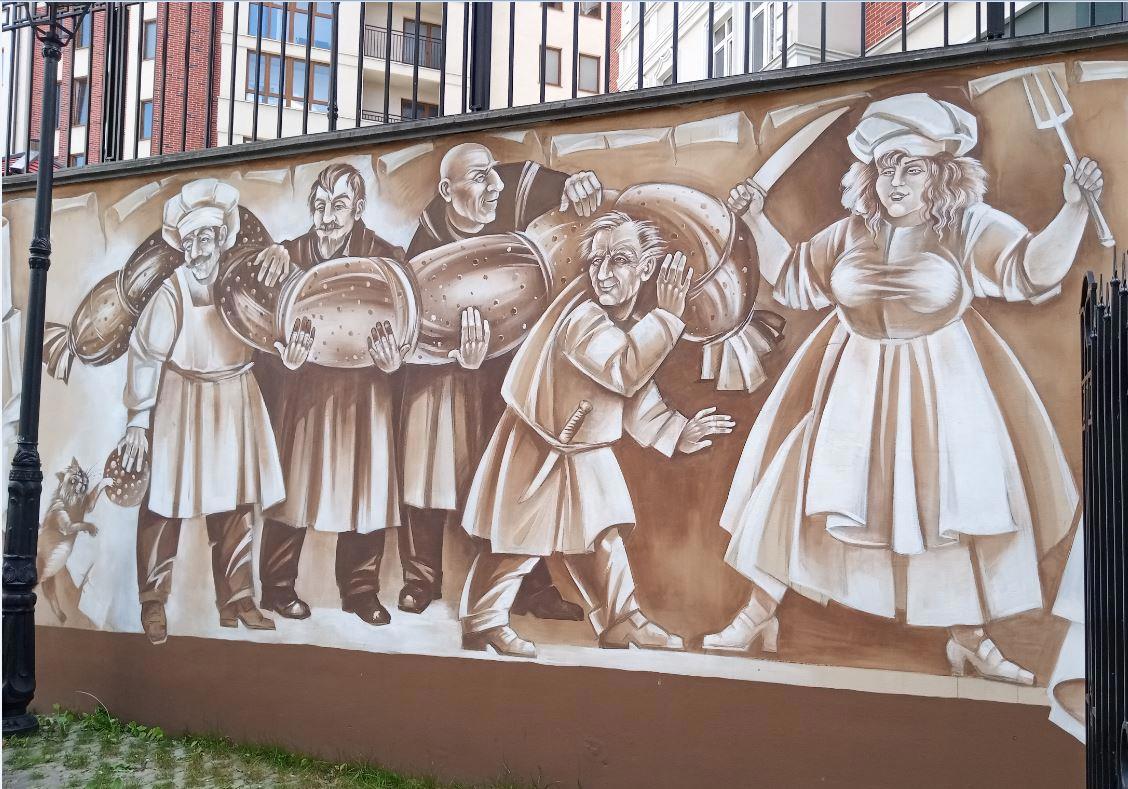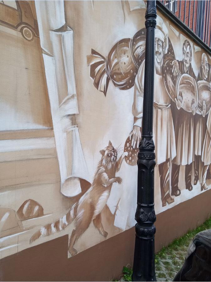 Понятно, что мы не могли пройти мимо фрески, где изображён кот, смиренно просящий своей доли колбасы: