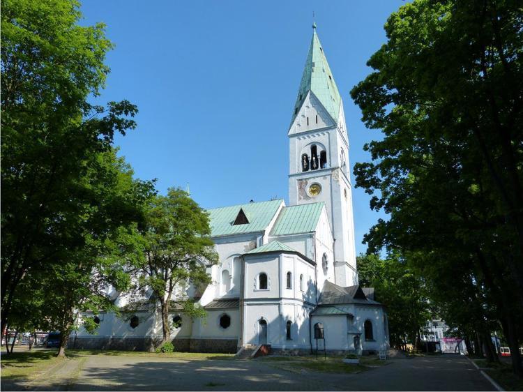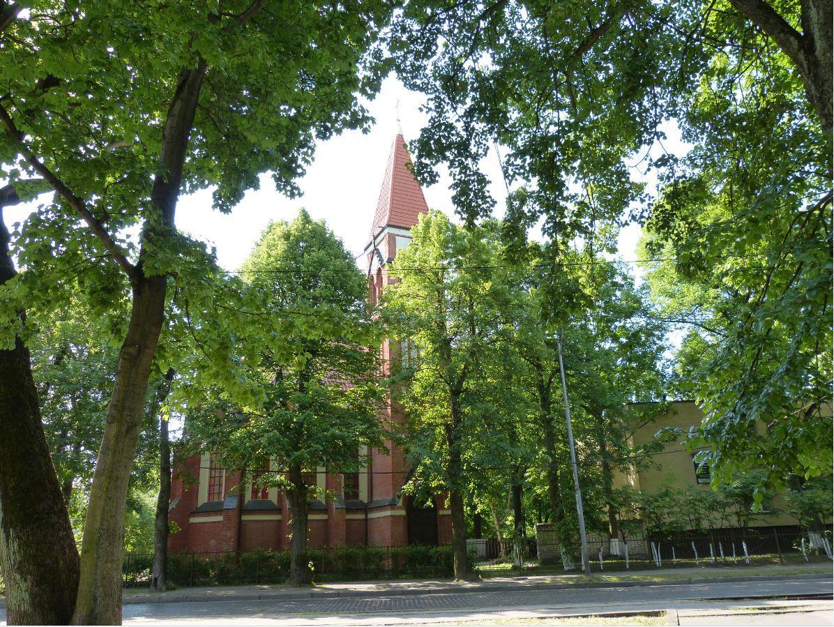 На противоположной стороне прячется в густой листве деревьев кирха Святого Адальберта, построенная в 1904 году стараниями всё того же Фридриха Хайтманна.