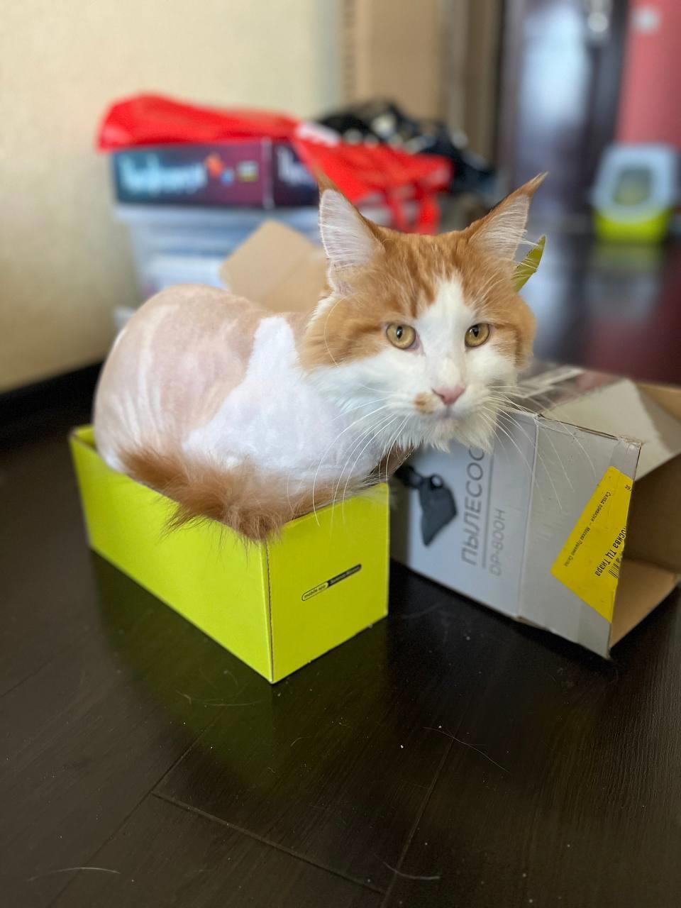 После стрижки Кнопа особенно полюбила эту коробку, залазить туда стало проще.