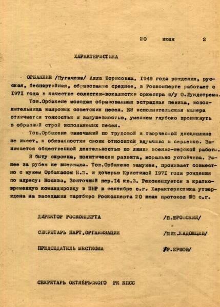 ОРБАКЕНЕ /Пугачева/ Алла Борисовна, 1949 года рождения, русская, беспартийная, образование среднее, в Росконцерте работает с 1971 года в качестве солистки-вокалистки оркестра п/у О.Лундстрема.