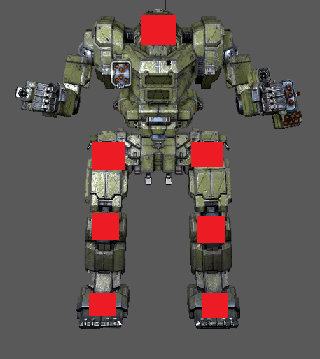 И так наш мех безусловно может быть пробит БОПСом или ПТУРом с любой дистанции... Вот только ему пофиг до тех пор пока не поражен кокпит, бедренный либо сустав на ноге - цели много меньшие лобовой проекции танка и при этом разнесенные по 10-метровой ОБЧРине. На рисунке отмечены области поражение которых выводит мех из строя с одного пробития.