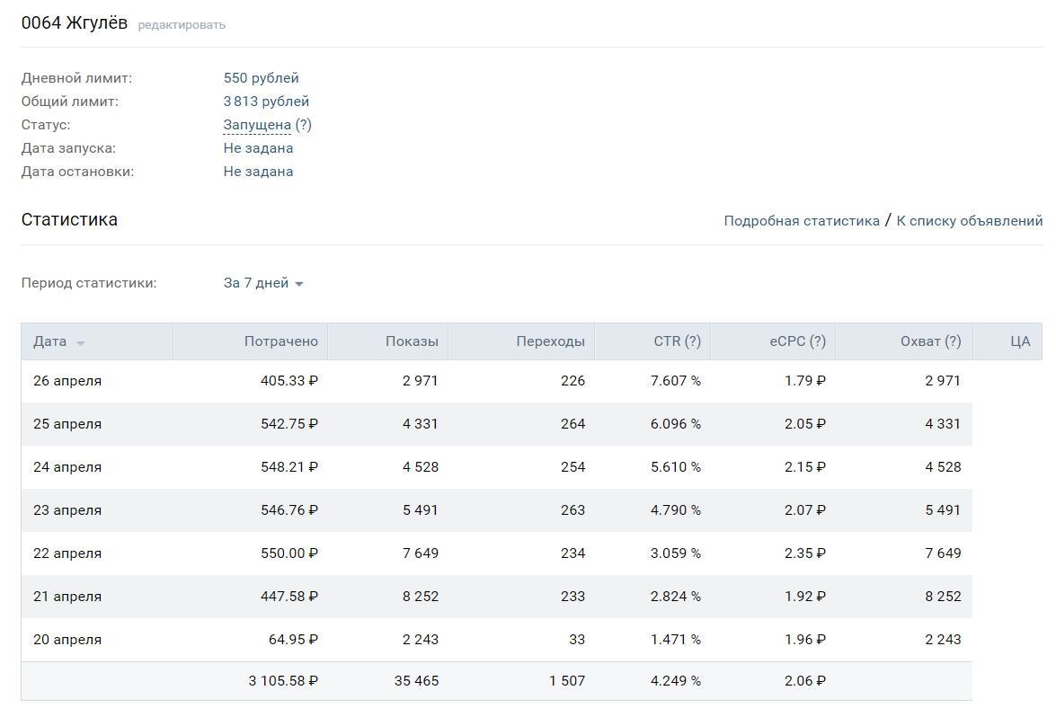 Те один переход стоит чуть больше 2 рублей. По сути, первоначальный бюджет окупился в первые сутки и, когда он достиг 6к, я просто вложил полученные 3к снова в рекламу. Итого я за неделю вложил 12к, порциями по 3к. Первый взнос был 18 апреля, реклама началась с 20го, затем, видя несомненный эффект, я докинул 23го апреля, 26 апреля, 30 апреля. Причем каждый раз бюджет(порядка 1к) еще оставался, так что реклама не прерывалась и идет по сей день.
