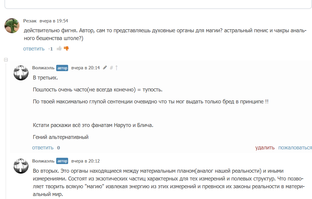 Человек просто высказался о том, что львиная часть авторов прописывающих механику работы сверхъестественных сил от базового уровня, до крайне подробных описаний... Все они дураки, потому что Резак смеётся над концепцией духовных органов(как бы это не называлось). Более того, по сути, он смеётся над верой и учениями многих религий. Ибо душа, как раз духовная структура(я уж молчу про чакры).
