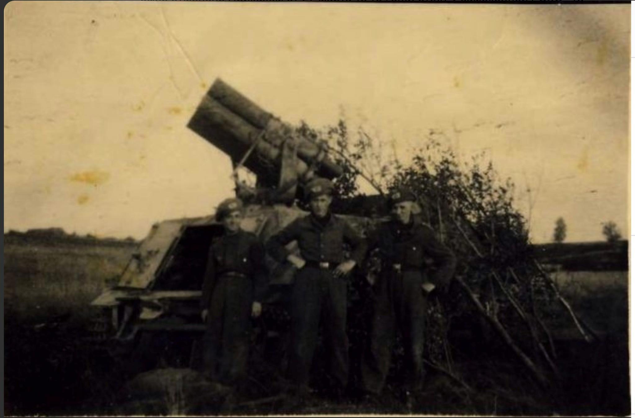 Немцы в "панцерберетах" (ношение которых было отменено Приказом от 27 марта 1940 года) стоят у самоходной РСЗО "15 cm Panzerwerfer 42 auf Sf", или Sd.Kfz.4/1,производство которой было начато в 1943 году.