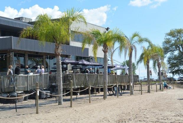 N.B. Пальмы, солнечный песчанный пляж, круизные корабли в порту, бар на берегу ...