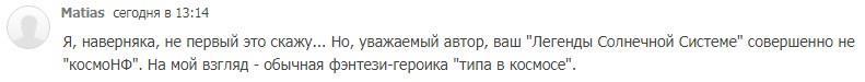 Интересный комментарий встретился в опубликованной недавно статье про космоНФ. Удивлен, что ЛСС настолько серьезно воспринимают. Несмотря на то, что роман - это эксперимент, написанный практически на коленке за два месяца.