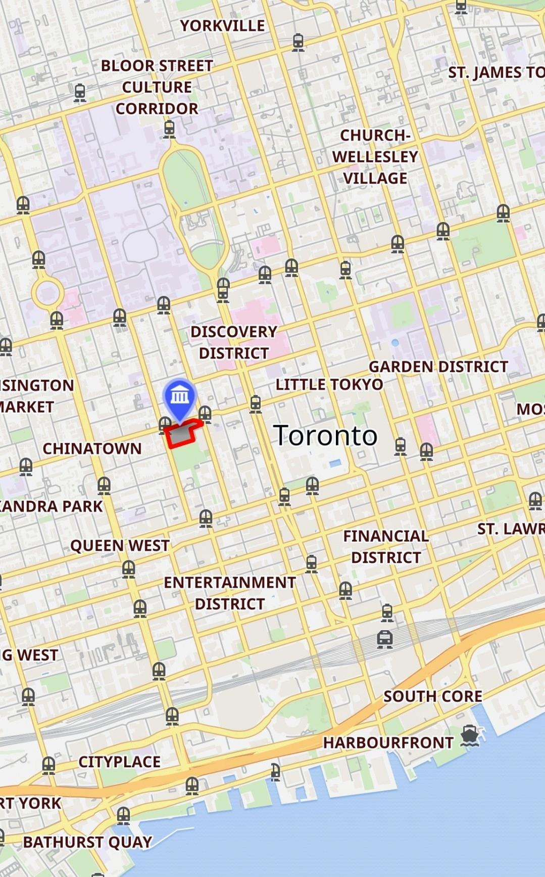 Музей расположен в районе Грейндж-парк в центре Торонто, на западной улице Дандас, между улицами Маккол и Беверли, к востоку от Чайнатауна и к западу от Маленькой Японии.