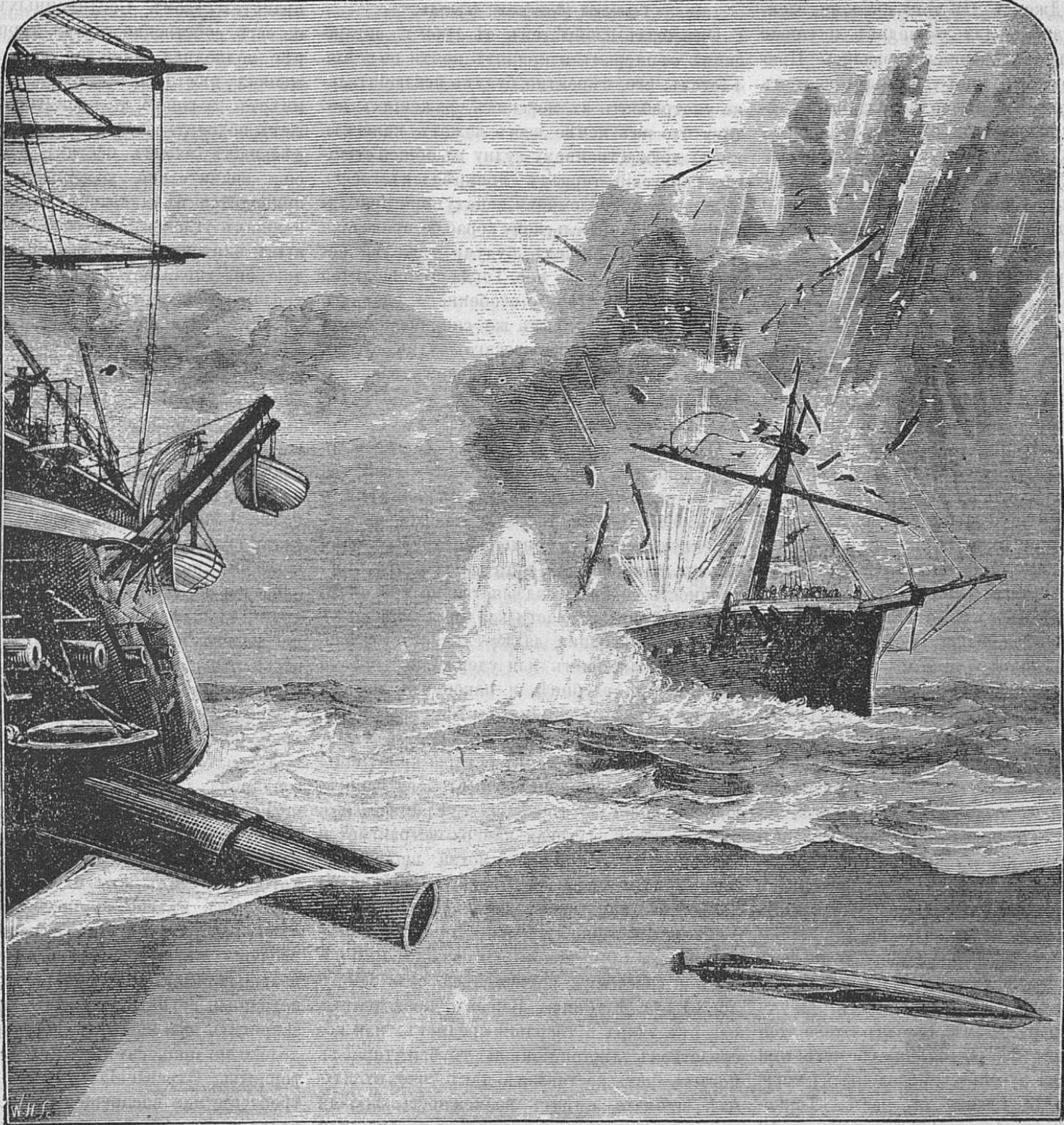Барон открыл рот, чтобы заорать вслед за боцманом: «Наши!» - и не успел. С парохода одно за другим ударили четыре пушки. Мачты, надстройки, белое с косым голубым крестом полотнище - всё заволокло белой клубящейся пеленой, и Греве, конечно, не смог разглядеть два блестящих жёлтым металлом веретена, одна за другой плюхнувшихся в воду и потянувших пенные следы к высокой белоснежной корме «Бакканта».