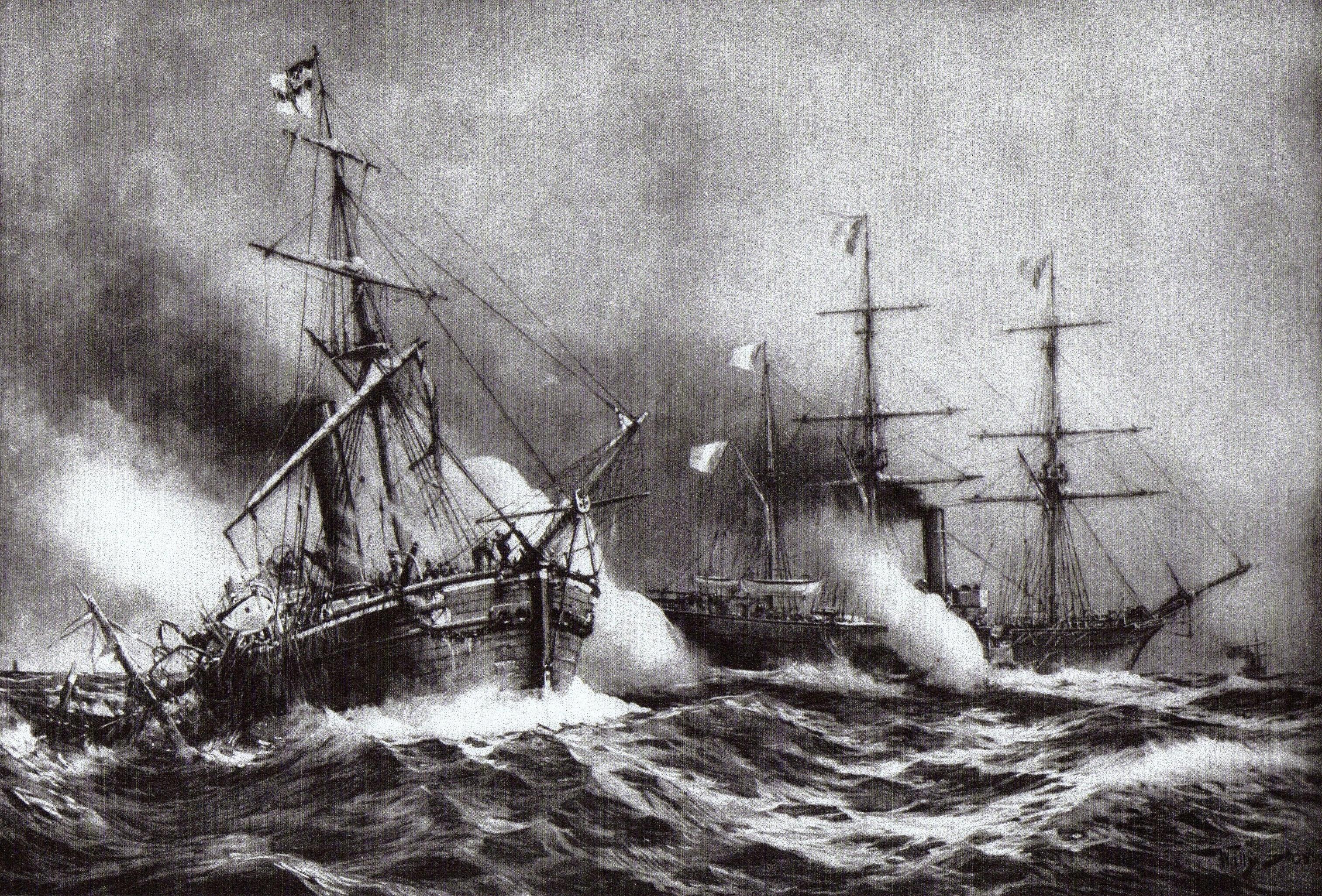 Но долго это продолжаться, конечно, не могло. Восемь семидюймовок в бортовом залпе – это чересчур для безбронного клипера, назначение которого ловить по морям жирных торгашей, а не вести эскадренный бой. Да, превосходные крупповские шестидюймовки сделали своё дело – комендорам удалось заколотить в неприятельский корвет не меньше четырёх снарядов, которые вызвали взрывы и пожар на батарейной палубе. Но это лишь подарило русским несколько лишних минут: «британец» описал циркуляцию, сменив подбойный борт и, волоча за собой шлейф угольной копоти из труб, смешивающийся с дымом непотушенных пожаров, снова пошёл на сближение.