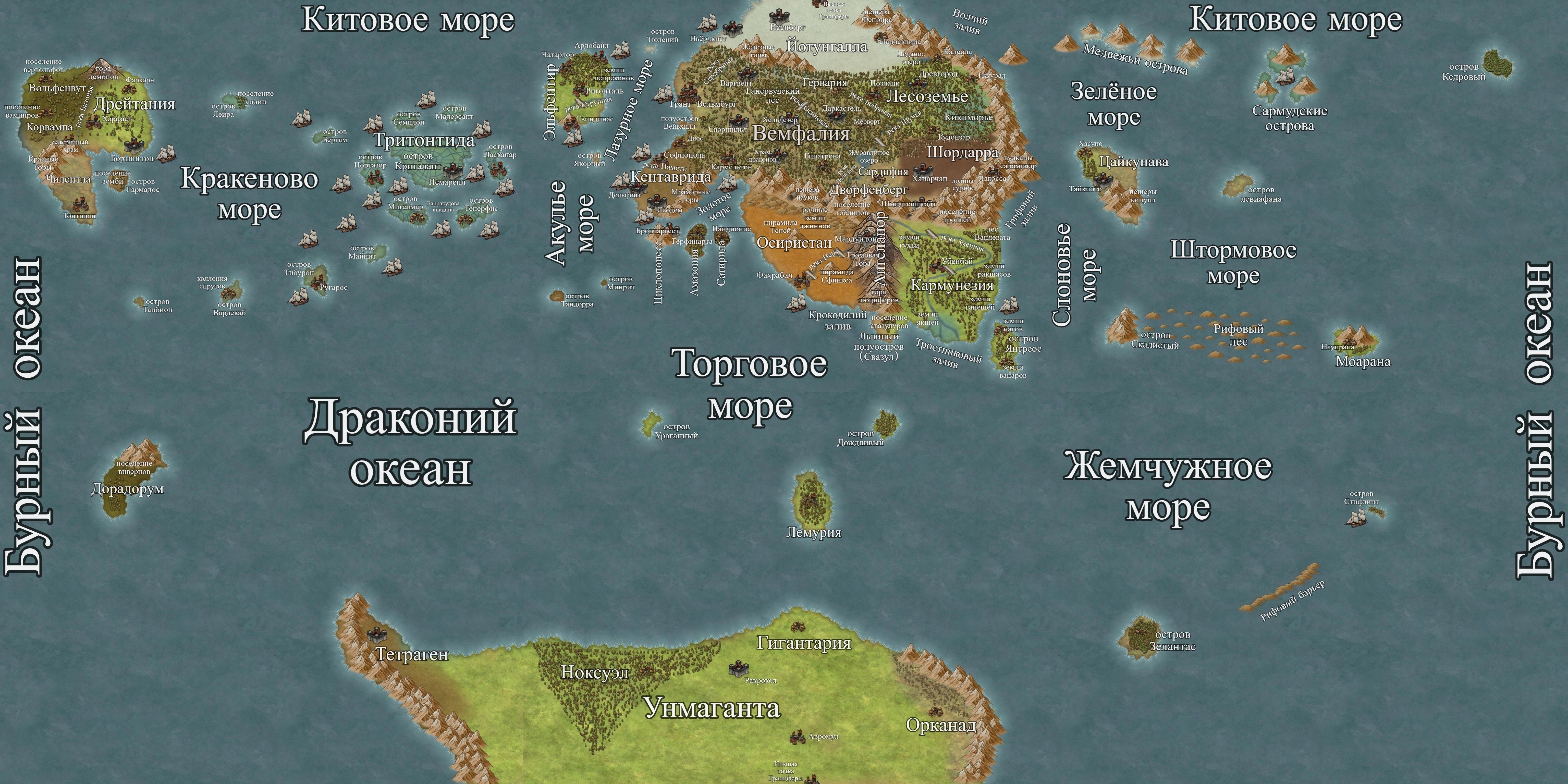 А вот карта всего мира Гранцферы. Расширение на восток начнётся уже с третьего романа, на юг — с четвёртого.