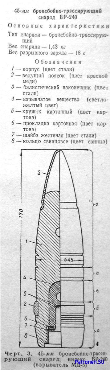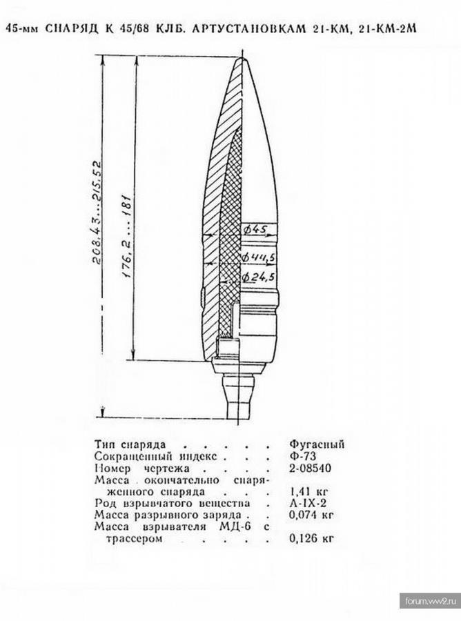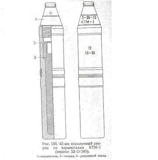 45-мм осколочный снаряд неудачный. Он вообще-то разработан был для 45-мм батальонной гаубицы обр. 1929 г. В 1932 г на вооружение поступила 45-мм противотанковая пушка. Было решено 45-мм осколочный выстрел сделать общим и для батальонной гаубицы, и для противотанковой пушки. Но гаубиц выпустили 100 шт. и сняли с вооружения, а унифицированный осколочный выстрел остался, видимо в ожидании новой батальонной гаубицы.