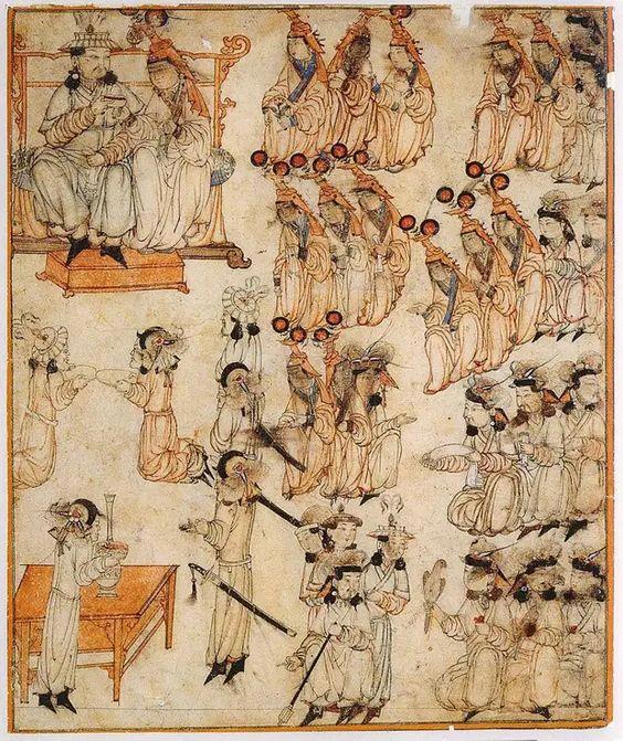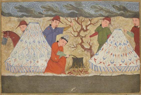 Вот референсы из персидского исторического труда "Джами ат-таварих" (если я не ошибаюсь, а то в папке "Референсы" все уже вперемешку; правда, это именно книжная миниатюра):
