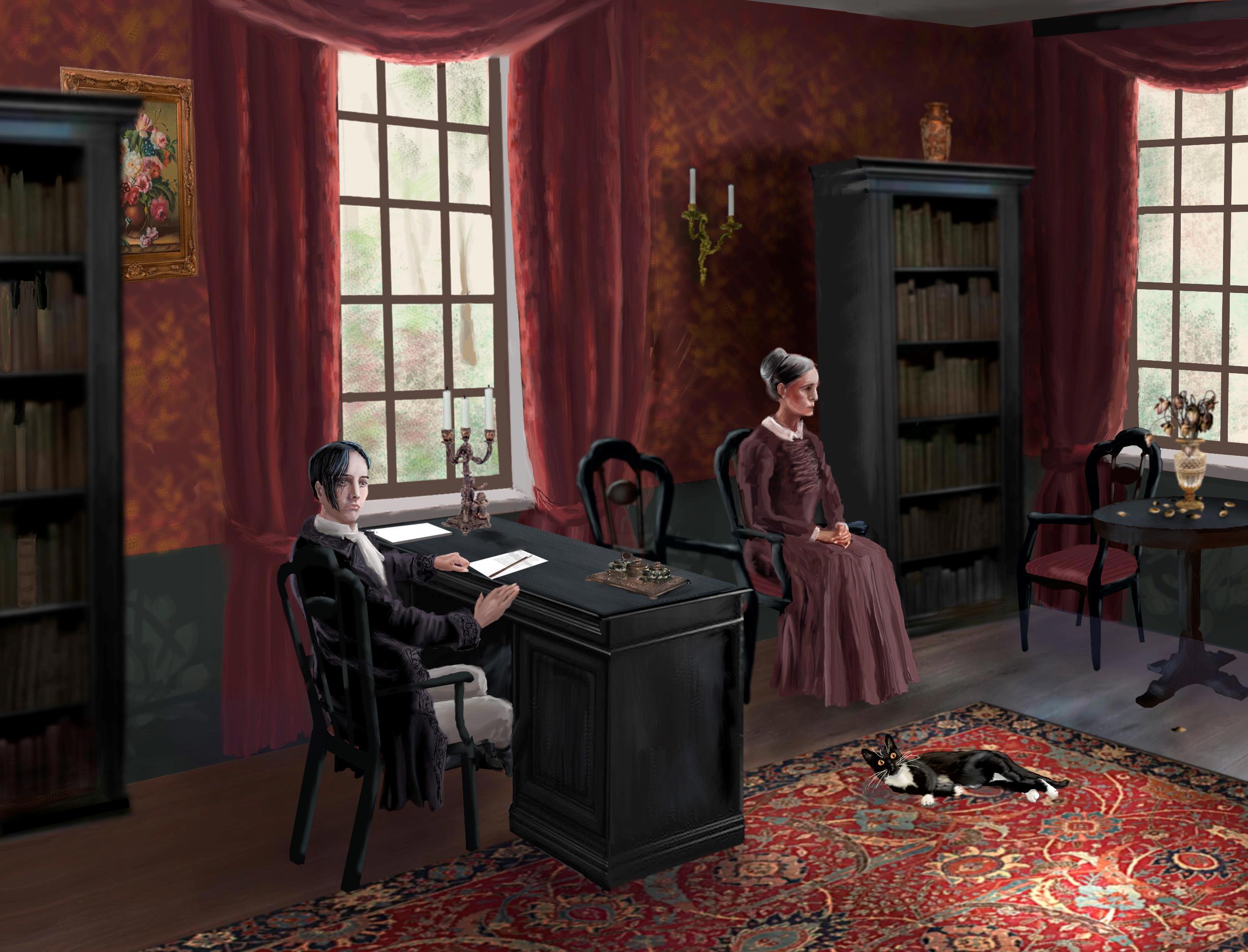 ), но я не рискнула рисовать многофигурную композицию, боялась просто не успеть, и решила всё же выбрать сцену экзамена, в том числе и потому, что в комнате герои будут лучше видны и узнаваемы.