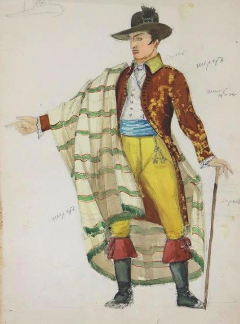 В эскизах костюмов Евгения Михайловича Шуйского: Констанцы и Бельмонта, созданных в 1950-ые гг. мы видим, как комизм исчезает — уступая место жгучей восточной страсти.