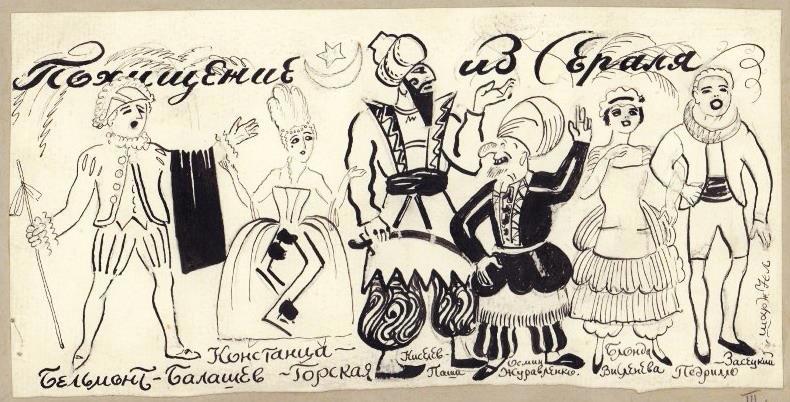 Любопытна карикатура на персонажей оперы: С.В.Балашов – Бельмонт, Р.Г.Горская - Констанция, В.В.Киселев - Паша, П.М.Журавленко - Осмин, А.В.Висленева - Блонда, П.И.Засецский – Педрилло (отметим оригинальнуюорфографию имени), поставленной 28.03.1925 г. на сцене Ленинградского государственного академического Малого оперного театра.
