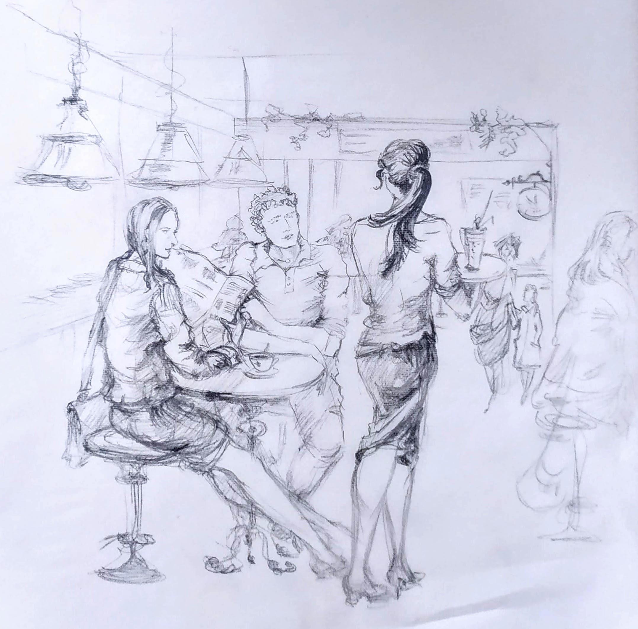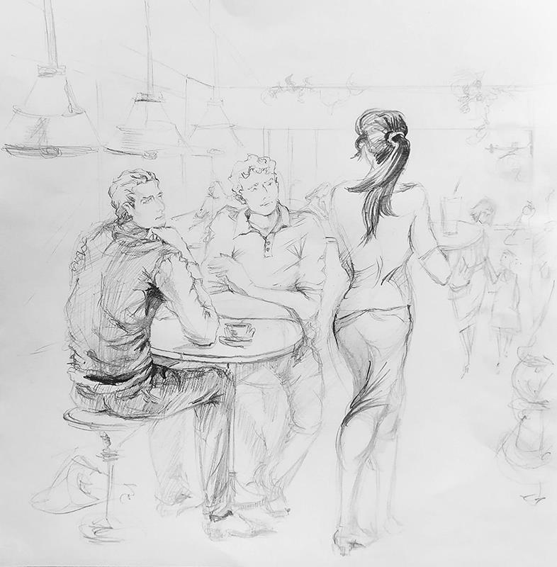 На третий же, последний из трех внеконкурсных, рисунок я посмотрела и подумала: "Ах, какое замечательное кафе. Ах, как жаль, что тут двое мужчин сидят". Увы, чтобы пересчитать сцены, где Ийкам сидит где-нибудь с каким-нибудь мужиком, пальцев одной руки даже многовато, а антураж сводит выбор на нет окончательно. Тем не менее, это все-таки оказалось не просто какое-то замечательное кафе! А недоразумение разрешилось тем, что на красивую девушку-голема там пялился не только Ийкам) Но! Самое интересное, что в итоге мне удалось выцыганить у Бьярти Дагура и изначальную версию, где Лимейк все-таки была! И, как по мне, она замечательная и совершенно незаслуженно откинутая.